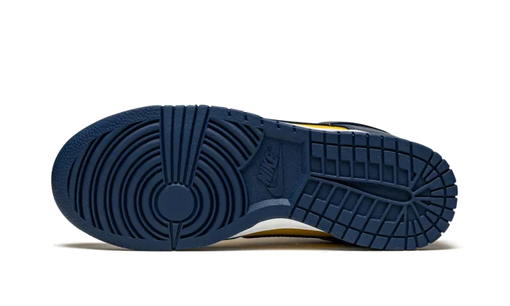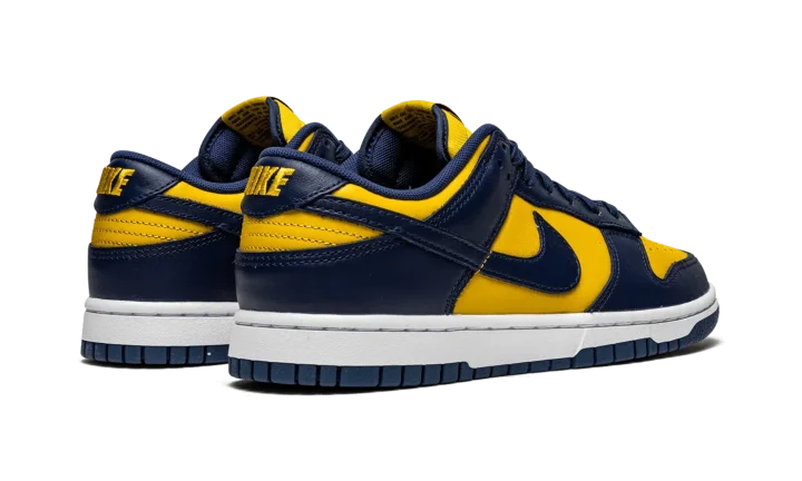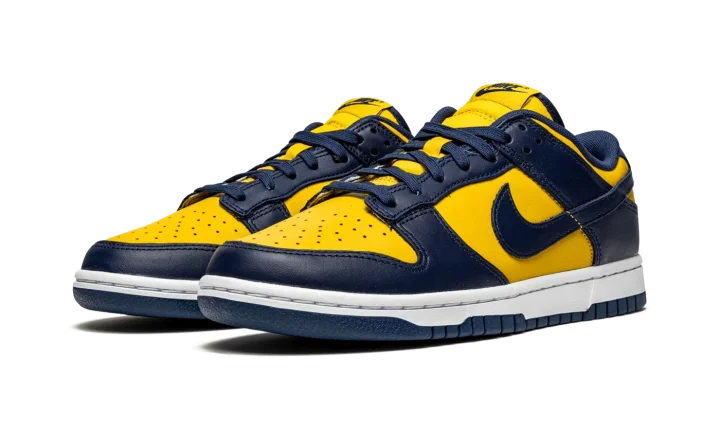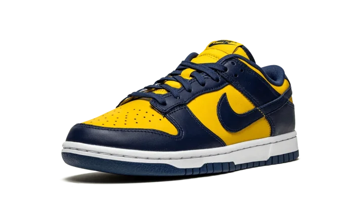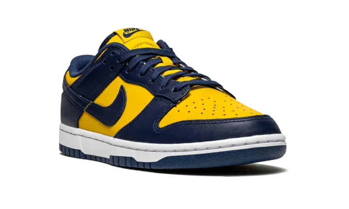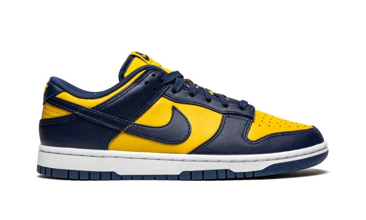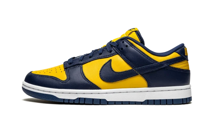 The Nike Dunk Low "Michigan" is the low-top version of an original Dunk colorway worn by the Michigan Wolverines basketball team in 1985. The "Michigan" first appeared in 1985's "Be True to Your School" collection of college basketball inspired Dunks. The Varsity Maize and Midnight Navy design was brought back in September 2020 on the Dunk High. This low-top silhouette of the retro basketball model follows the same style cadence as the original and high-top edition. Varsity Maize leather appears on the perforated toe and on the mid-panel, collar, and heel. Contrasting Midnight Navy leather panels on the upper break up the look. A navy blue Swoosh graces either side of the shoe and yellow "Nike" embroidery is stitched onto the heel. Blue shoe laces are layered over the Varsity Maize nylon tongue. The Nike Dunk Low "Michigan" is an iconic colorway of the retro basketball, skateboarding, and lifestyle shoe. Release date: April 16, 2021.