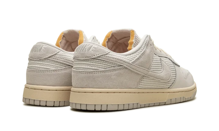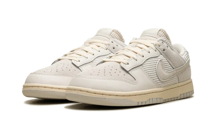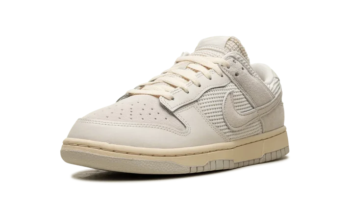 The Nike Dunk Low "Phantom/Light Bone" is a colorway of the retro basketball shoe with an interesting mixture of materials. On the Dunk Low "Phantom/Light Bone," the upper features a knit and ribbed textile materials on the midfoot, collar, and tongue panels. Suede can be found on the perforated toe and heel. A classic Swoosh logo appears on the sides of the shoe. Exposed foam padding can be seen on the tongue, giving the shoe a "DIY" vibe. Underfoot, a Coconut Milk-colored rubber midsole and Light Bone rubber outsole complete the look. Release date: April 5, 2024