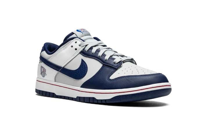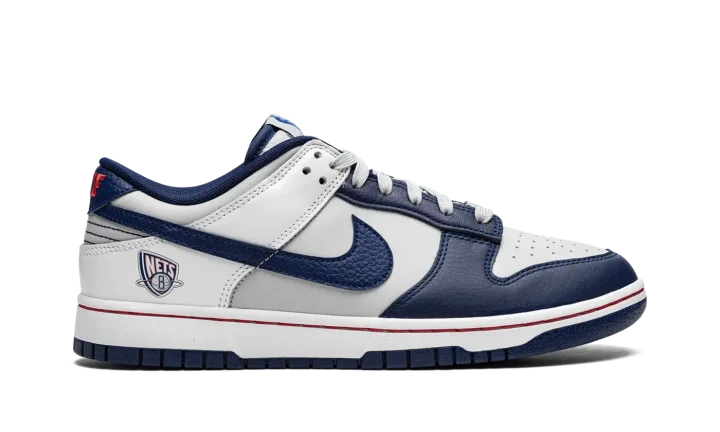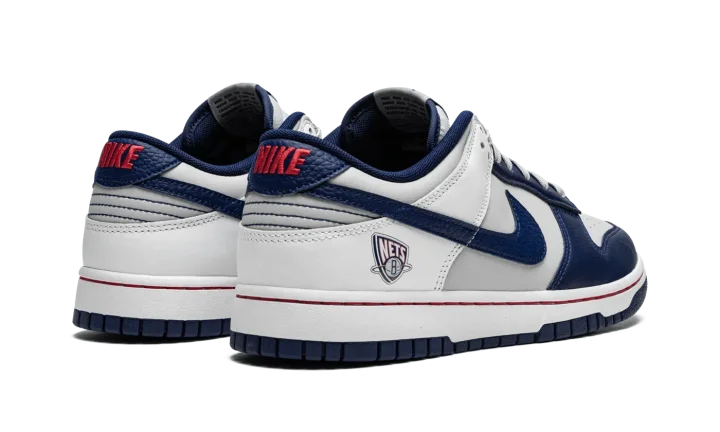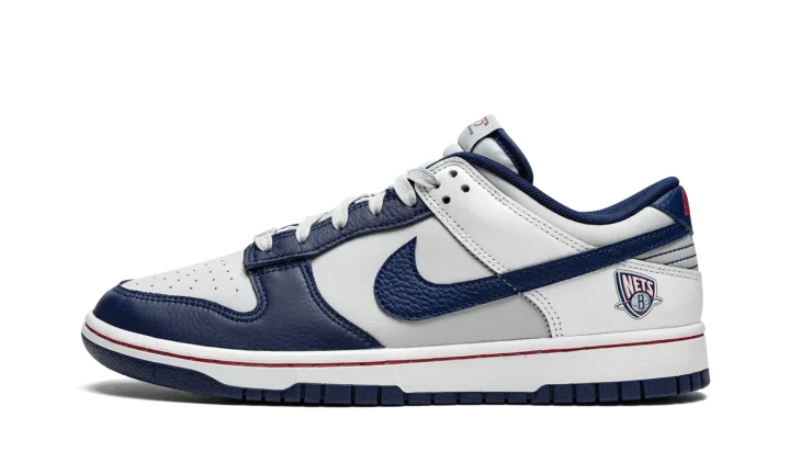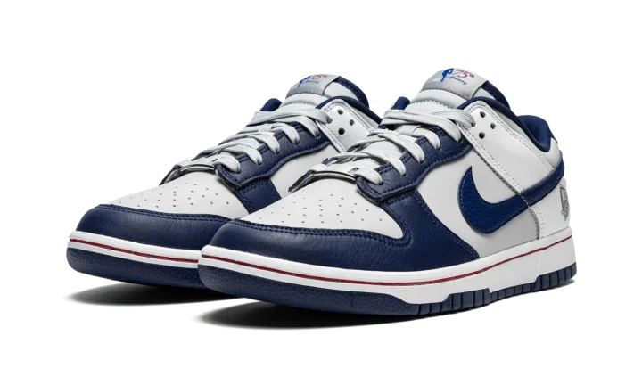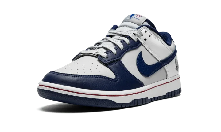 The NBA x Nike Dunk Low "75th Anniversary - Brooklyn Nets" is a special edition colorway of the vintage basketball shoe that celebrates the NBA's 75-year anniversary. While nicknamed the "Brooklyn Nets," the shoe's details and branding are indeed inspired by the team's time in New Jersey. As the New Jersey Nets, the Eastern Conference basketball team featured navy blue and white as its primary uniform colors, and the two colors appear on its various overlays. The New Jersey Nets' old school logo is found on the heel. Unique branding celebrating the NBA's 75-year anniversary appears on the tongue and red "Nike" detailing is embroidered on the heel. A two-tone, white midsole and blue rubber outsole complete the look. Release date: October 19, 2021