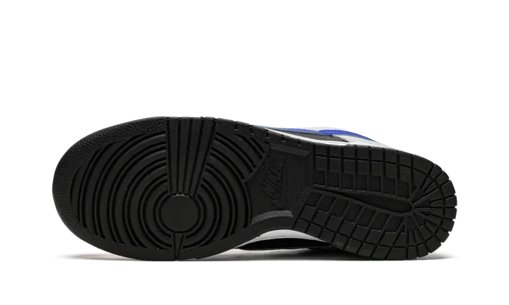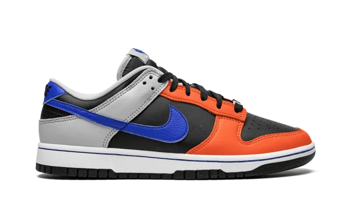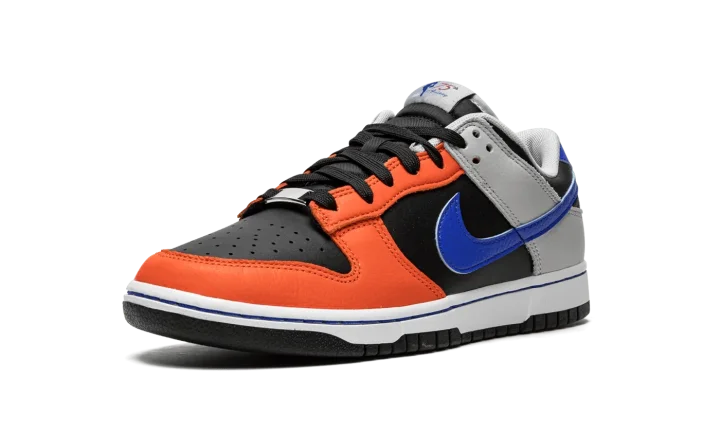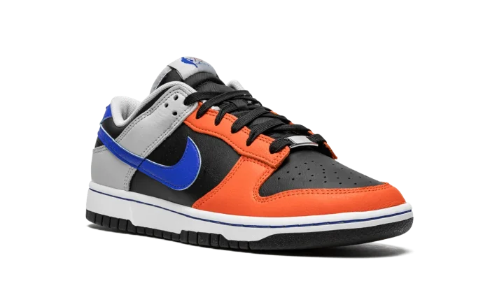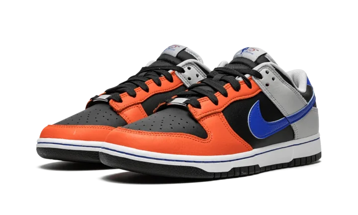 The NBA x Nike Dunk Low "New York Knicks" is a special edition colorway of the retro basketball shoe that honors the NBA's 75-year anniversary. The "New York Knicks" colorway is one of multiple basketball-inspired Dunks from the NBA x Nike 75th Anniversary collection. The shoe features a black leather base with orange leather overlays on the toe cap, forefoot, and eyelets. A Racer Blue Swoosh is found on either side and a blue leather heel tab on the back is complete with black "Nike" embroidery. The colors are inspired by the Knicks team uniforms. The NBA's 75-year anniversary appears on the tongue. A two-tone, white midsole and black rubber outsole complete the look. Release date: February 1, 2022