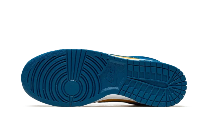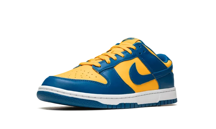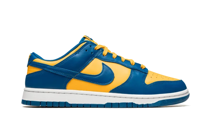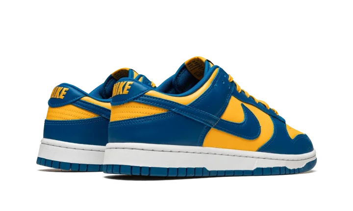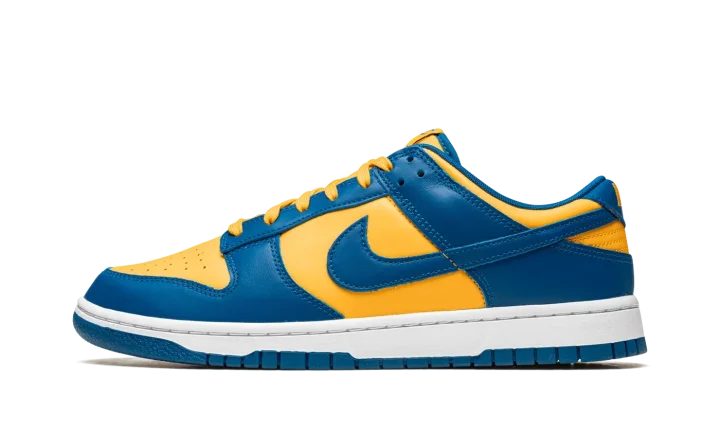 The Nike Dunk Low "UCLA" is an August 2022 release of the retro basketball shoe that draws inspiration from the UCLA Bruins college basketball team's uniforms. Although not officially tied to UCLA, this two-tone, blue-and-yellow Dunk nonetheless shows appreciation to the storied program. The perforated toe, mid-panel, collar, and heel are designed in yellow leather. Blue Jay-colored leather can be found on the overlay panels and on the Swoosh branding on either side of the shoe. Yellow "Nike" branding is embroidered on the heel, and blue "Nike" and Swoosh logos are found on the yellow nylon tongue tag. Underfoot, a white rubber midsole and blue rubber outsole complete the look. Release date: August 9, 2022