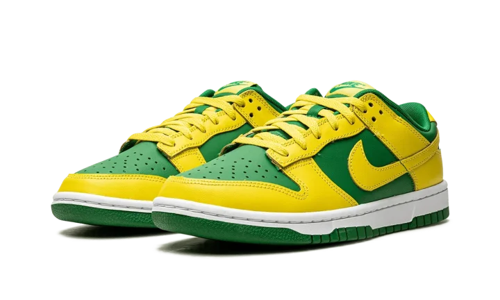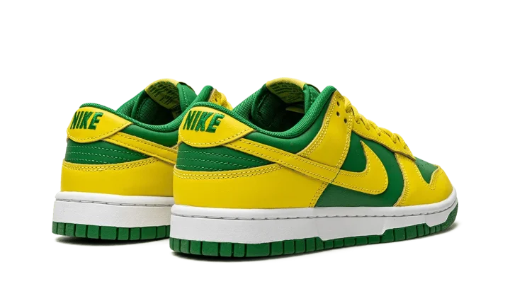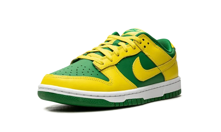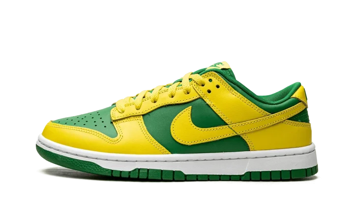 The Nike Dunk Low "Reverse Brazil" is a two-tone, yellow-and-green colorway of the retro basketball shoe that flips the color scheme of the model's popular "Brazil" style. As its name suggests, the "Reverse Brazil" reverses the color coordination of the "Brazil" Dunk, and it doesn't miss the mark. The shoe features Yellow Strike leather overlays and Swoosh branding on an Apple Green-colored leather base. A green "Nike" logo is embroidered on the yellow leather heel tab. Classic "Nike" detailing can be found on the tongue. A white rubber midsole and green outsole complete the look. Release date: February 15, 2023