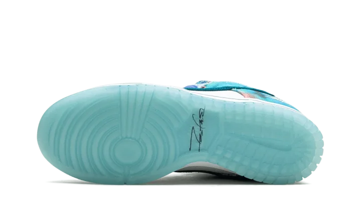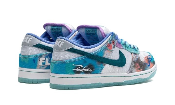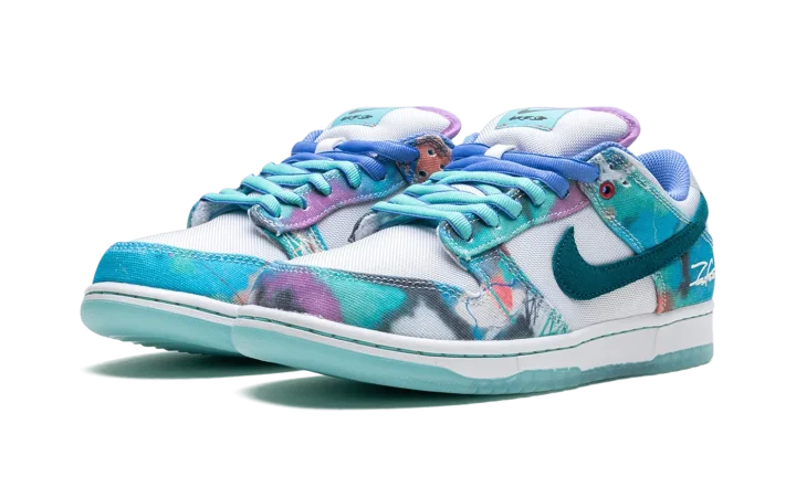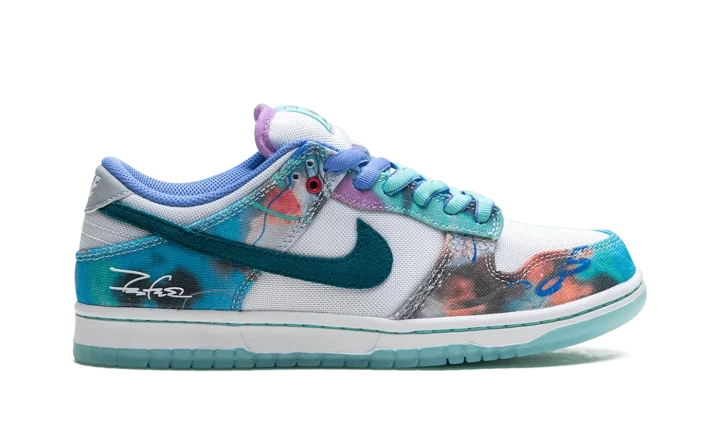 The Futura Laboratories x Nike SB Dunk Low "Bleached Aqua" is a collaboration by the iconic street artist and Nike SB on a summertime-ready colorway of the retro skate shoe. The shoe features a white canvas base and multicolor canvas overlays with Futura's signature artwork. The artist's signature is found on the lateral side of the heel, while "FL" branding appears on the opposite side. A suede Geode Teal-colored Swoosh appears on both sides. A co-branded tongue tag adds to the shoe's unique character. Underfoot, a blue-tinted translucent outsole completes the look. Release date: May 18, 2024