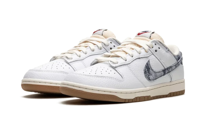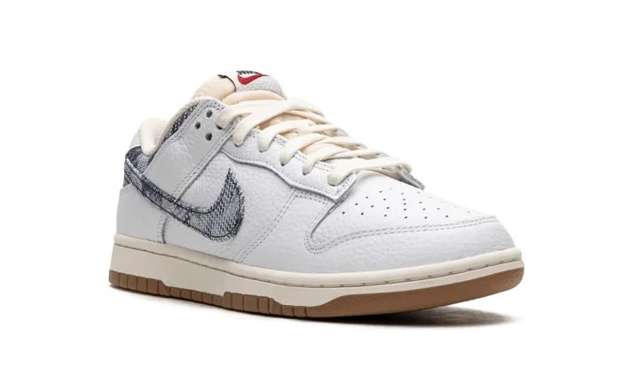 The Nike Dunk Low "Washed Denim" is a colorway of the retro basketball shoe with unique vintage-inspired details. The "Washed Denim" Dunk Low features a white leather upper with Washed Denim detailing on the Swoosh and heel tab. The cream tongue evokes a vintage, aged look, as do the laces and the cream rubber midsole. Classic "Nike" branding is embroidered on the heel and printed on the tongue above a Swoosh. A gum rubber outsole completes this unique Dunk. Release date: June 3, 2023