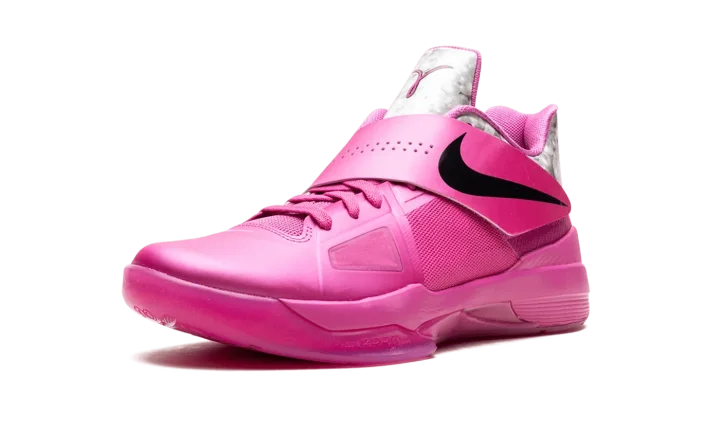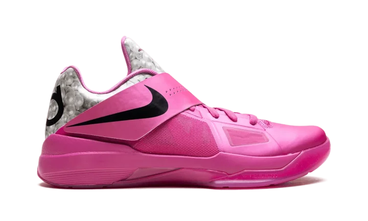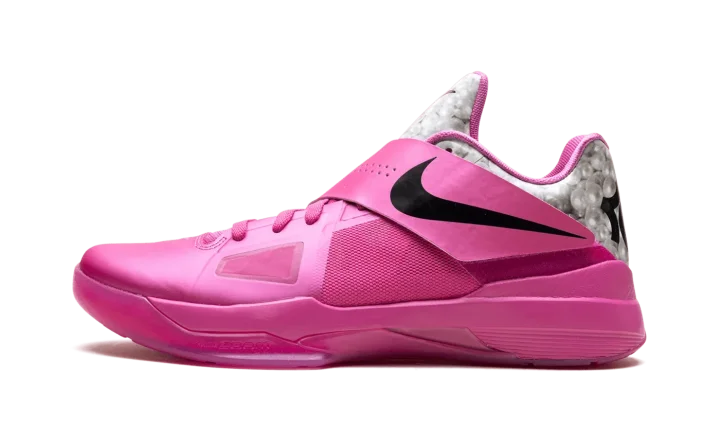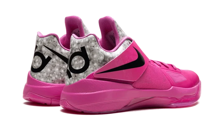 The Nike KD4 "Aunt Pearl" that originally came out in 2012 is getting a retro release in 2024. This iteration of Kevin Durant's fourth signature sneaker model is a tribute to Durant's aunt who died of cancer. The upper is rendered predominantly in a bold pink with medial, tongue, and heel panels that showcase a pattern of pearls. Other design details include a midfoot strap with a large Swoosh.