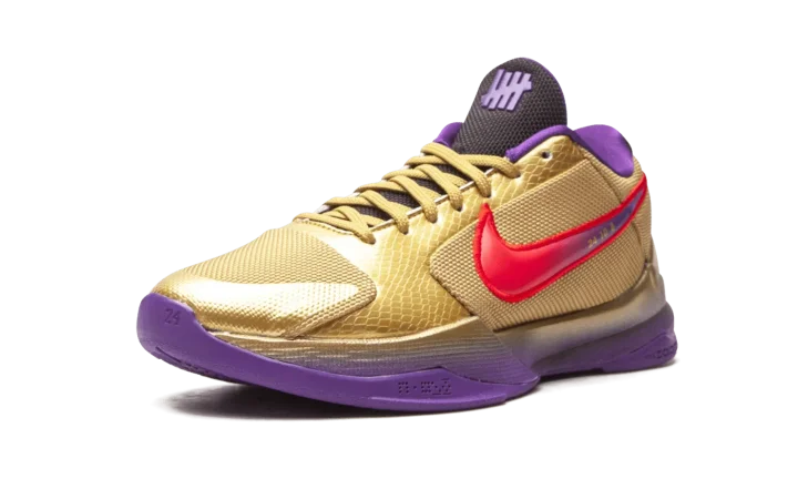 The Undefeated x Nike Kobe 5 Protro "Hall of Fame" is a special collaboration between the California based sneaker boutique and Nike Basketball that celebrates Kobe Bryant's introduction to the Basketball Hall of Fame in 2021. The Nike Kobe 5 Protro, one of Bryant's most beloved signature shoes, displays a luxurious metallic gold finish as a salute to the "Black Mamba's" five NBA Championships. The upper's lightweight gold mesh base is contrasted by tonal snakeskin-textured leather overlays on the forefoot and eyelets. Both the left and right shoe feature a red leather Swoosh, with purple accenting the Swoosh on the left shoe and pink accenting the Swoosh on the right shoe. The left shoe's Swoosh displays Kobe's "24," "10," and "8" jersey numbers with the Los Angeles Lakers and Olympic Team USA as a commemoration of his basketball career. Both the tongue and the heel display additional mismatched detailing in the way of Kobe's "The Sheath" and Undefeated's "Five Strikes" branding. Release date: May 12, 2021.