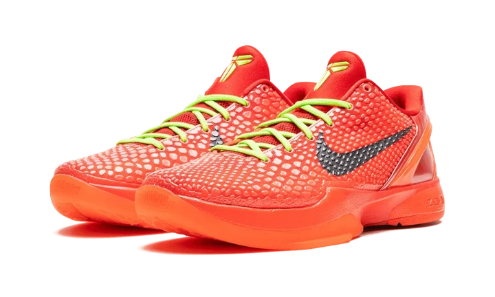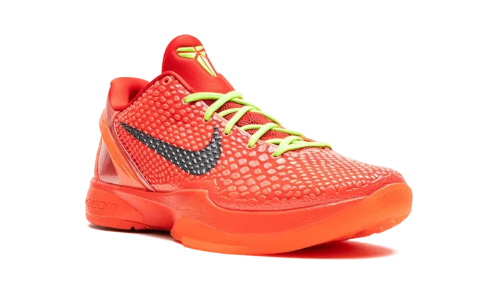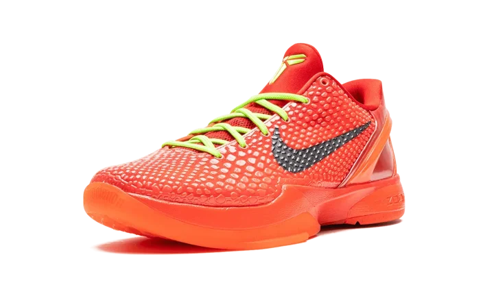 The Nike Zoom Kobe 6 Protro "Reverse Grinch" is an alternate version of the popular, Christmas-inspired colorway of Kobe Bryant's sixth signature shoe. Inspired by the mostly all-green Nike Kobe 6 "Grinch" colorway, the "Reverse Grinch" flips the original design's color block to feature a red upper with green laces. The shoe is complete with a Bright Crimson snakeskin textured upper with black Swooshes on the sides. Both the laces and Kobe's "The Sheath" logo are designed in Electric Green. A Bright Crimson rubber sole completes the look. Release date: December 16, 2023