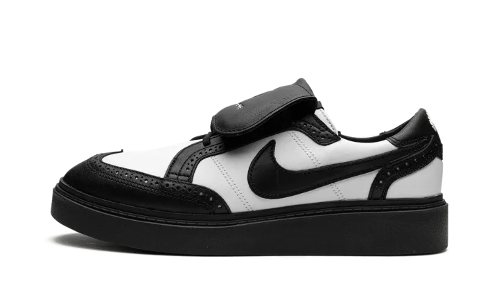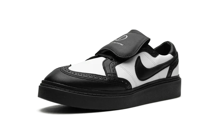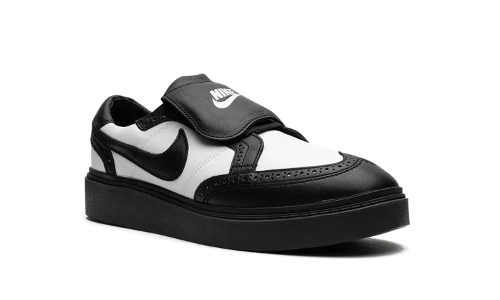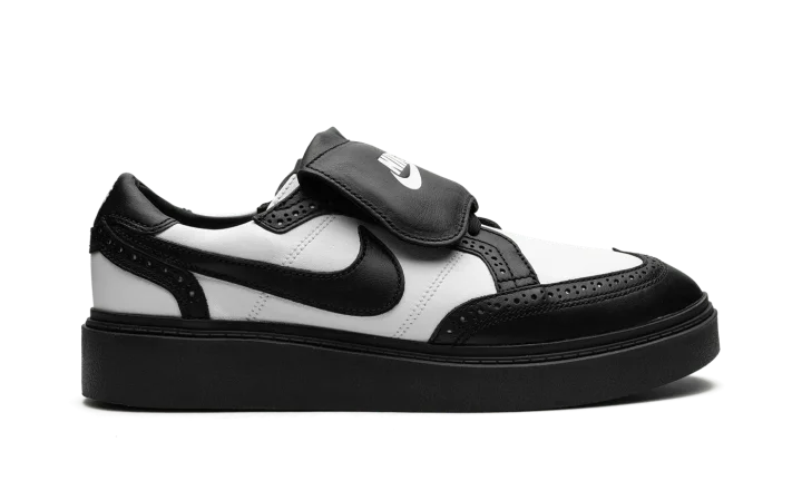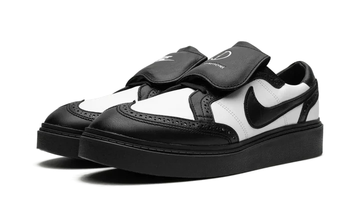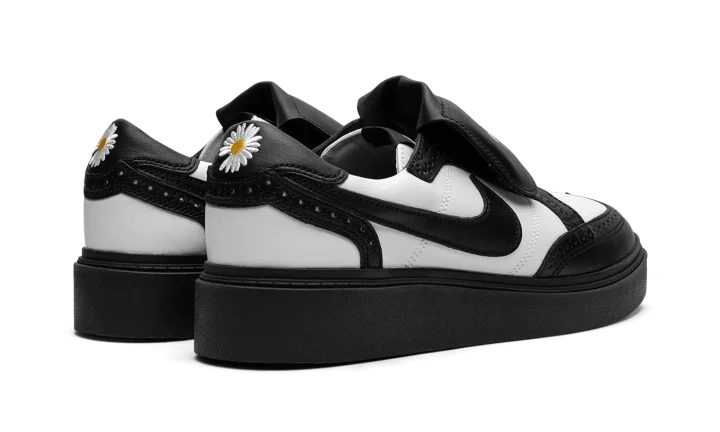 The G-Dragon x Nike Kwondo 1 "Panda" is a collaboration by the South Korean hip-hop artist and Nike on the brogue-style shoe that debuted in December 2021. The Nike Kwondo 1 is named after the Korean martial art of taekwondo, and its design is inspired by several footwear styles, most notably brogue-style dress shoes, Stefan Janoski's Nike SB Janoski line, and '90s-era football cleats. This is evident from the perforations found along each panel, the overall shape of the shoe, and the overlapping tongues. As for the rest of the design, the shoe appears in a "Panda" inspired color block with white leather on the base and black leather on the overlays and on the Swoosh. Dual "Nike" and "Peaceminusone" logos are found on the left and right tongues, respectively. An embroidered daisy detail on the heel is a nod to G-Dragon's logo. More classic, formal-looking footwear inspires the look of the shoe's black rubber sole.