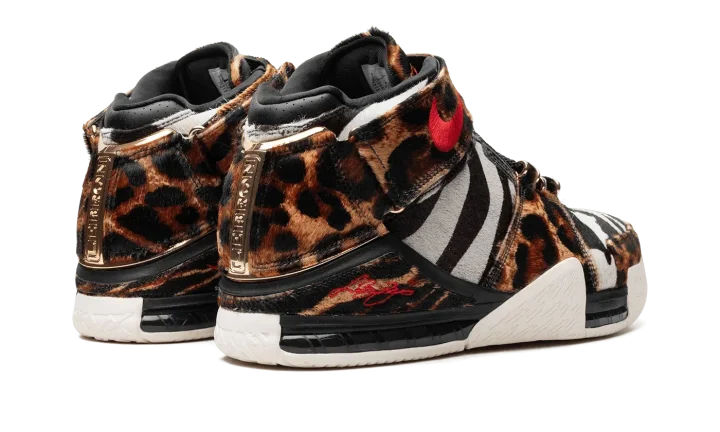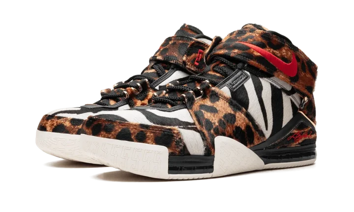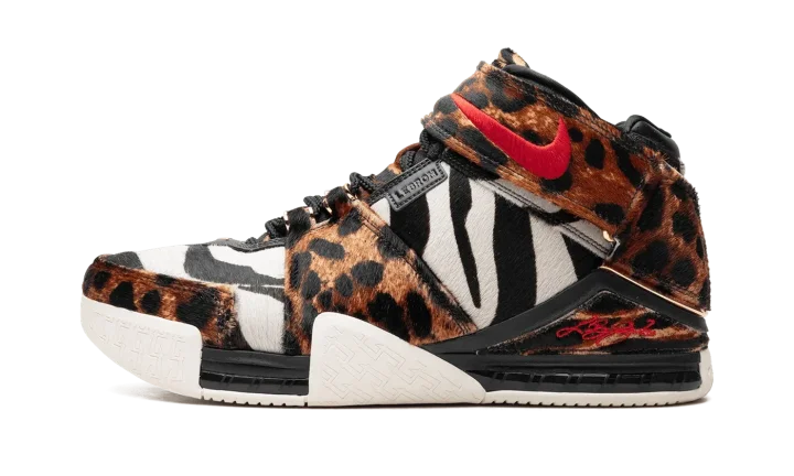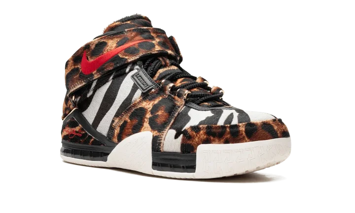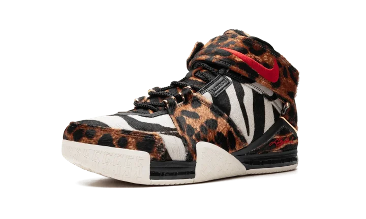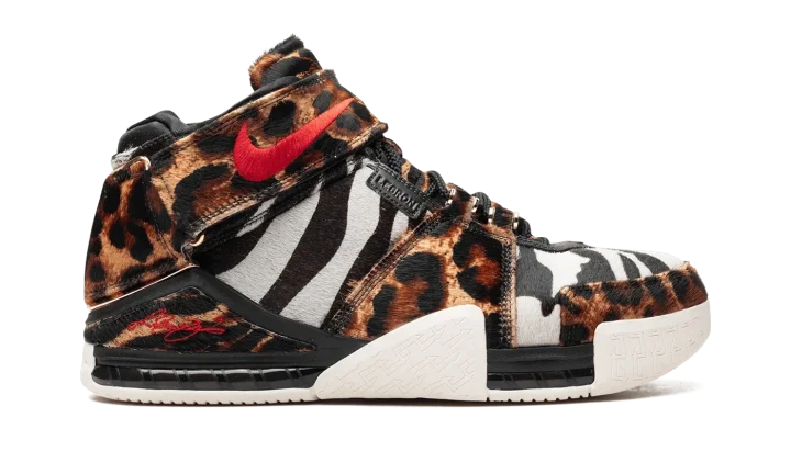 The Nike LeBron 2 "Beast" is a colorway of LeBron James's second signature shoe that originated as a Player Exclusive version for James in celebration of the model's 10th anniversary in 2014. In 2023, Nike Basketball finally released the LeBron 2 "Beast" for the first time at retail, much to the appreciation of sneaker collectors. The upper has an undeniably interesting combination of animal-inspired patterns, with zebra print appearing on the base and cheetah print landing on the overlays. An oversized red Swoosh is seen on the strap on the collar. LeBron's signature branding with Nike appears on various points throughout the shoe. Release date: November 16, 2023