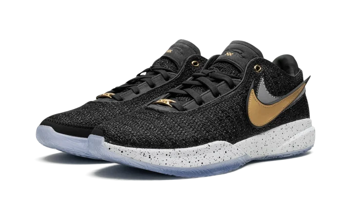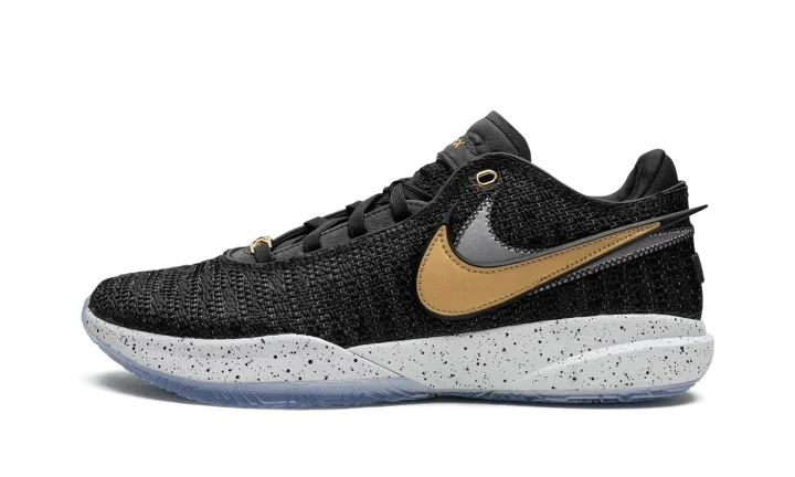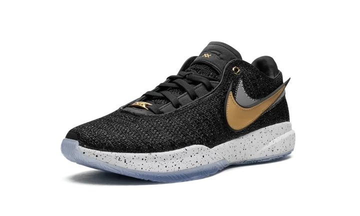 The Nike LeBron 20 "Black/Metallic Gold" is a luxurious colorway of LeBron James's twentieth signature performance basketball shoe with gold accenting. The "Black/Metallic Gold" Nike LeBron 20 features a black woven upper contrasted with a Metallic Gold Swoosh layered over a grey Swoosh on the sides. Special "XX" branding appears on the gold lace dubrae. The speckled midsole is complete with an Air Zoom Turbo cushioning pod in the forefoot and a Zoom Air cushioning unit in the heel. Release date: April 6, 2023