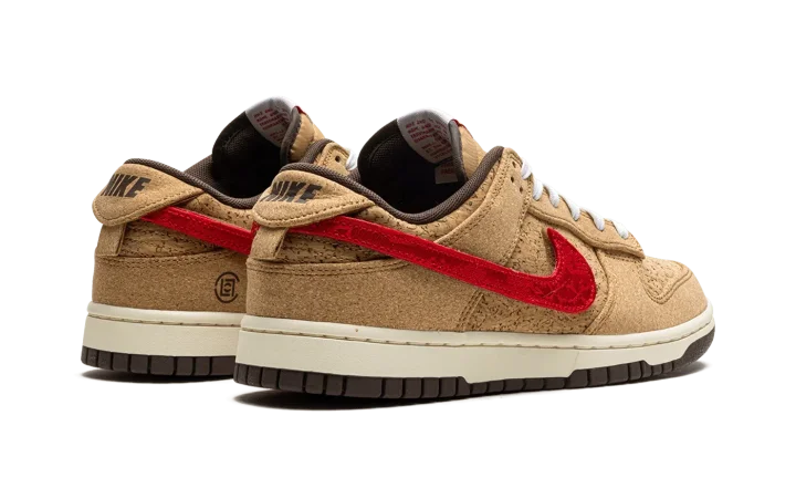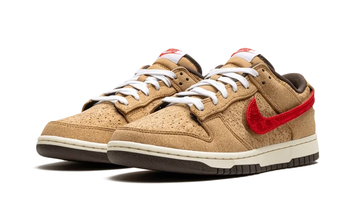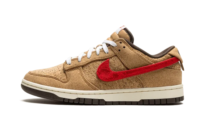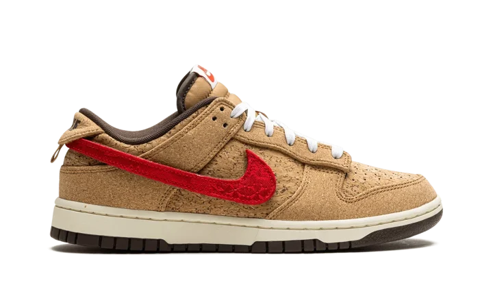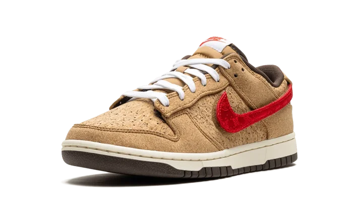 The Clot x Nike Dunk Low "Cork" is a collaboration between Edison Chen's clothing brand and Nike on a colorway of the popular sneaker made from cork. Inspired by Chen's use of a cork board in his creative process, the "Cork" Dunk Low, as its name suggests, is made from cork. The shoe's entire upper is constructed of the sustainable textile, including the base and the overlays. White laces appear on the cork-colored padded nylon tongue, while the brown inner lining reflects the shoe of brown seen on the upper. Detachable red Swooshes made of silk appear on the sides, while co-branding can be seen throughout the shoe. Underfoot, a Sail-colored midsole completes the look. Release date: June 23, 2023