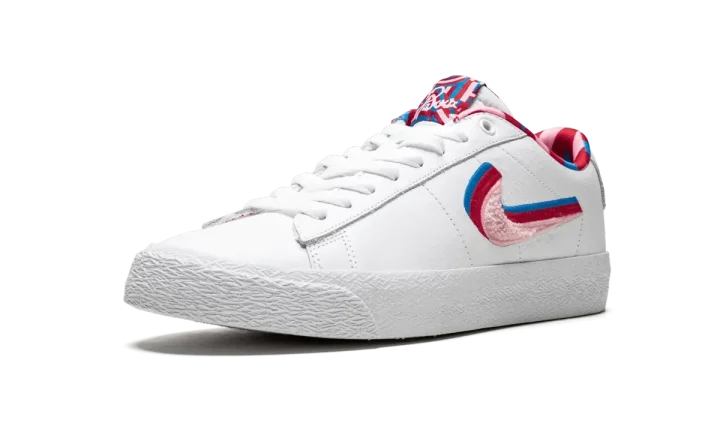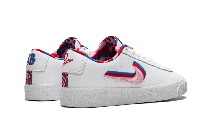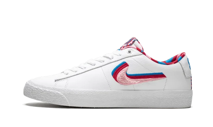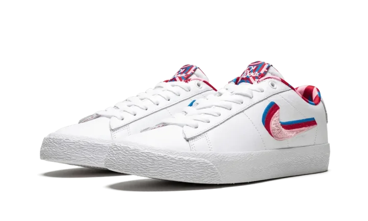 The Parra x Nike SB Blazer GT is one half of the 2019 collaboration from the famed Dutch artist and Nike SB. Released alongside a matching Dunk Low, the premium edition of the Blazer Low GT by Parra features a white leather upper with a quadruple-colored Swoosh graphic embroidered with the top pink layer in chenille. The same accent colors are found on the geometric graphic print on the interior as well as the tongue tag. "SB" and "Parra" in text designed by the artist is found on the heel tabs to complete the incredible colorway. The Parra x Nike SB Blazer GT released on July 27, 2019.