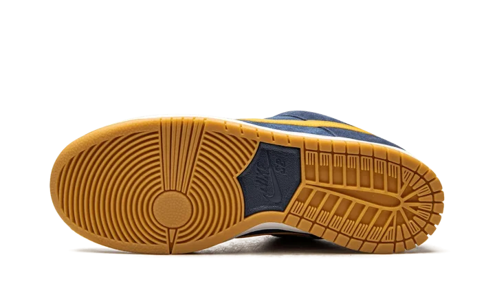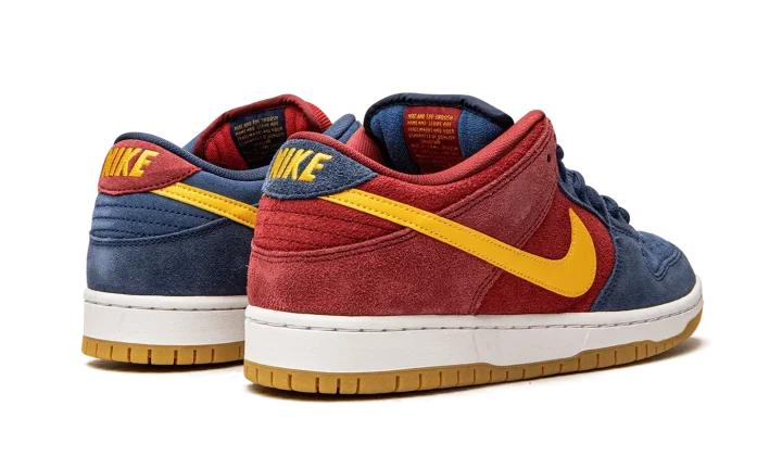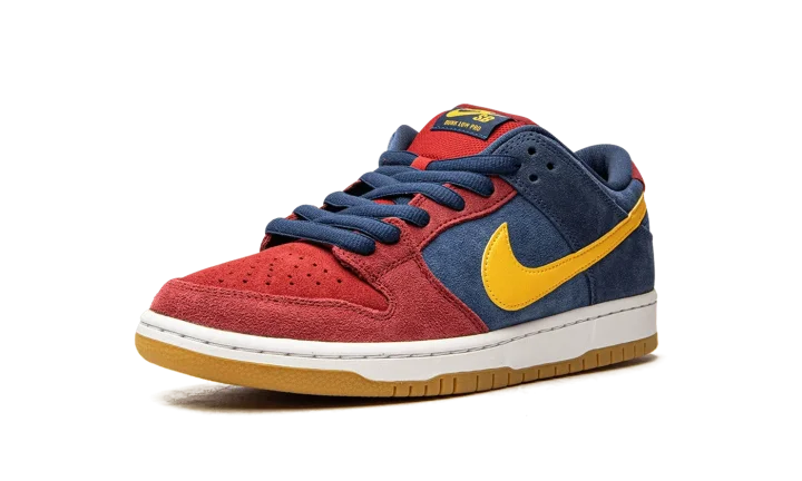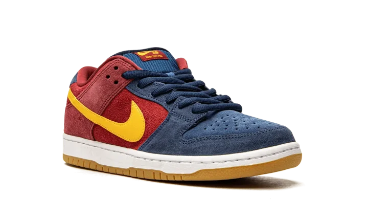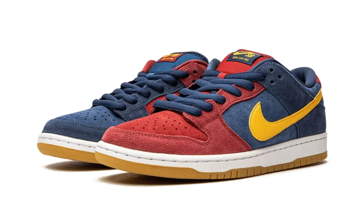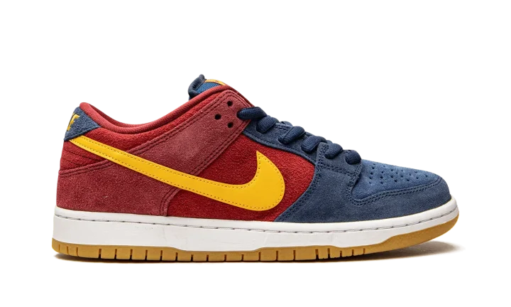 The Nike SB Dunk Low "Barcelona" is a colorway of the low-top skate shoe that looks to famed soccer club FC Barcelona for design inspiration. While not officially associated with the Spanish soccer team, the "Barcelona" is dressed in the same blue, red, and yellow colors as FC Barcelona's kits. The upper of the mismatched colorway features a combination of maroon and navy blue suede. Gold leather Swoosh branding appears on both sides and gold "Nike" detailing is embroidered on the maroon and navy heel tabs on the left and right shoes, respectively. The traditional "Nike SB" insignia on the tongue tag of the mismatched tongues is designed in gold, as well. A Zoom Air cushioning pod is dropped into the heel of the white rubber midsole for comfort whether on or off a skateboard. The look is rounded into form with a gum outsole.