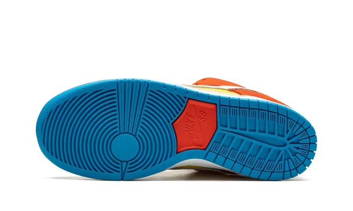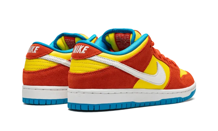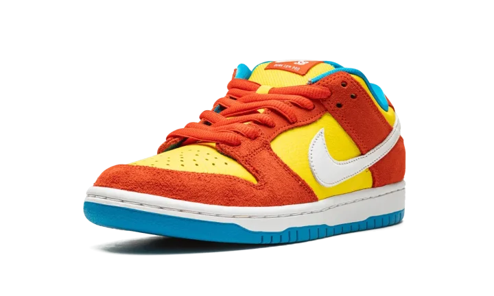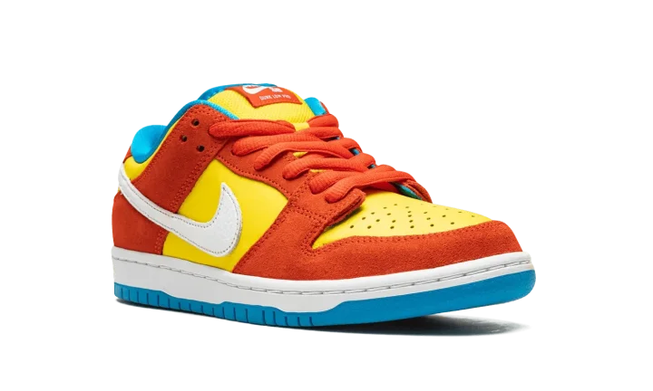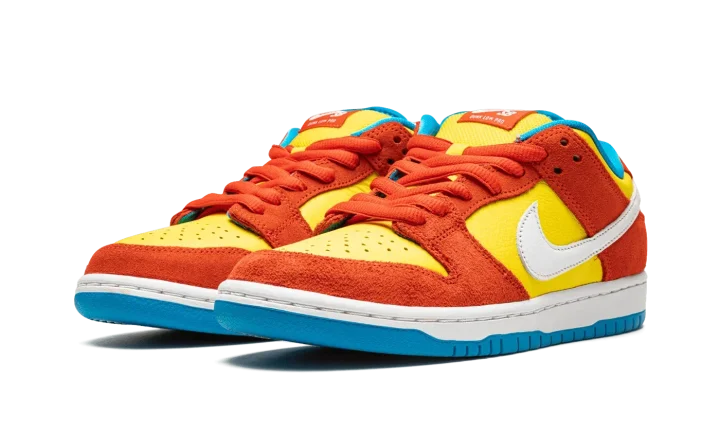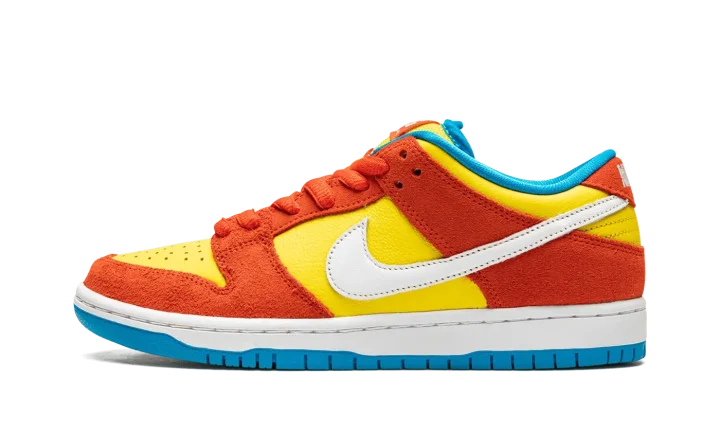 The Nike SB Dunk Low "Bart Simpson" is a colorway that calls to mind the outfit and appearance of the iconic cartoon character from "The Simpsons." While not an official collaboration between Nike SB and "The Simpsons," the "Bart Simpson" SB Dunk Low is nonetheless a nod to Bart, as well as the cartoon series. The colorway is the successor to Nike SB's previous "Simpsons" inspired Dunks, the "Homer" from 2004, and the "Marge" from 2008. The shoe features fiery Habanero Red suede overlays, a white leather Swoosh, and a yellow leather base. A white "Nike" logo appears on the heel and classic "Nike SB Dunk" branding is found on the tongue tag. The underside of the tongue, the collar, and rubber outsole are all designed in a hue dubbed Blue Hero. Altogether, the red, yellow, and blue color palette is inspired by Bart Simpson's appearance.