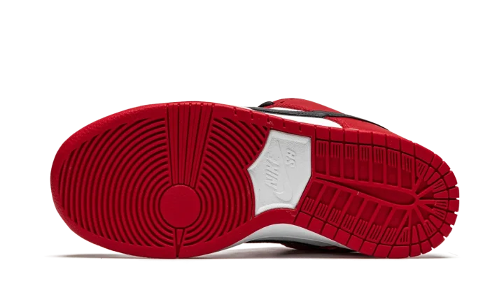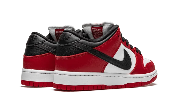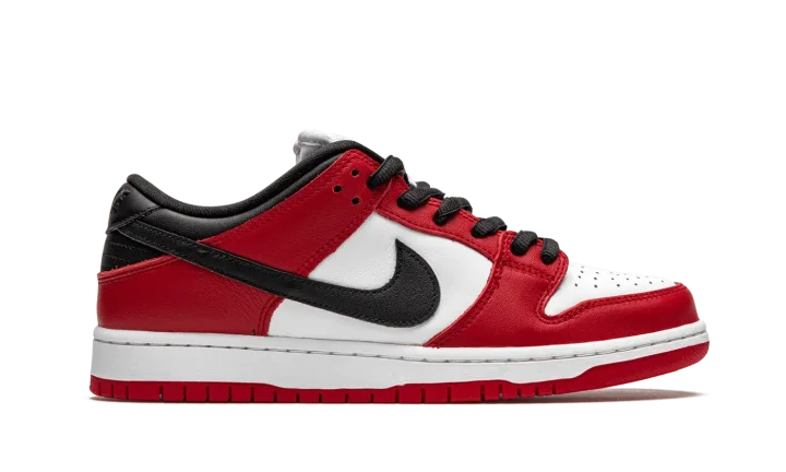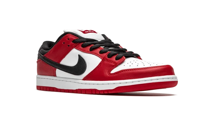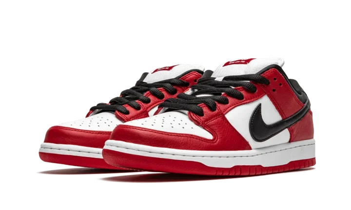 The Nike SB Dunk Low "Chicago" is dedicated to the styling and color block used on the original Air Jordan 1 of the same nickname from 1985. A tribute to Michael Jordan's all-time classic signature shoe, this "Chicago" Dunk is almost a spitting image of the Jordan 1 Low. The two distinctly retro silhouettes are a product of Nike's mid-80s performance basketball footwear campaign. The skate-adjacent Dunk features a white leather perforated toe with white leather mid-panel walls. Fiery red leather overlays dot the forefoot, eyelets, and heel. Branding appears in the form of a black leather Swoosh on either side of the shoe, tonal "Nike" embroidery on the heel, and white accenting Nike SB detailing on the red nylon tongue tag. Given that this is the skateable version of the Dunk, the shoe displays a puffy white mesh tongue for impact absorption. Finishing touches include black cotton laces and a two-toned white midsole and red outsole. Release date: Fall 2020.