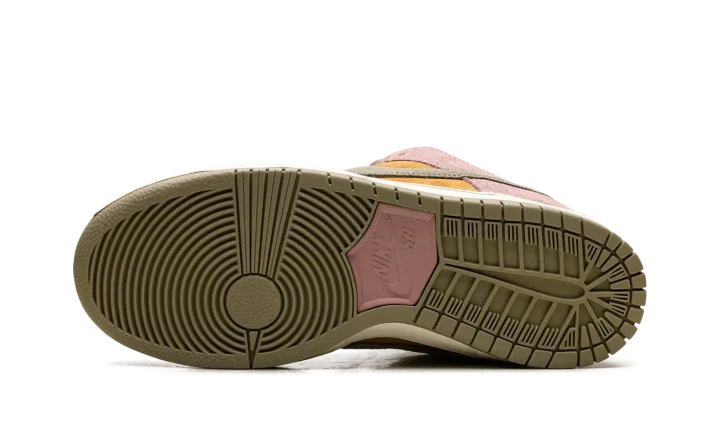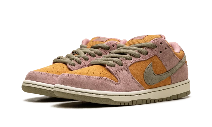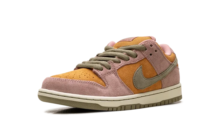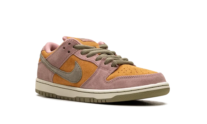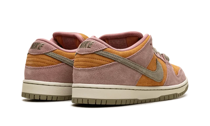 The Nike Dunk Low SB 'Red Stardust' (HJ4135 600) has a muted orange suede upper with contrasting pink overlays and a light olive Swoosh. The Nike SB logo decorates the tongue tag and insoles, equipped with a Zoom Air heel unit.