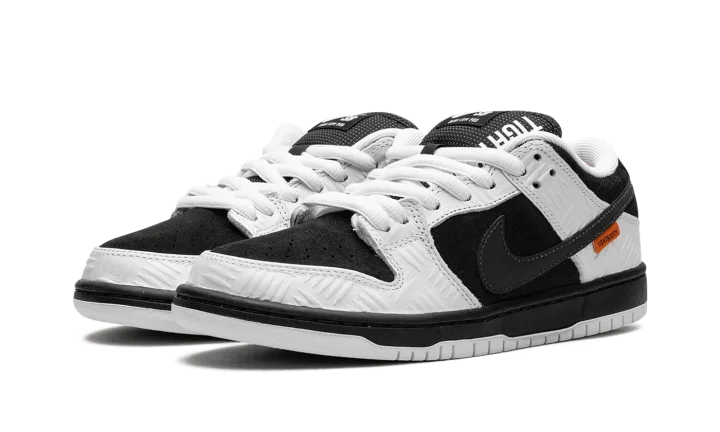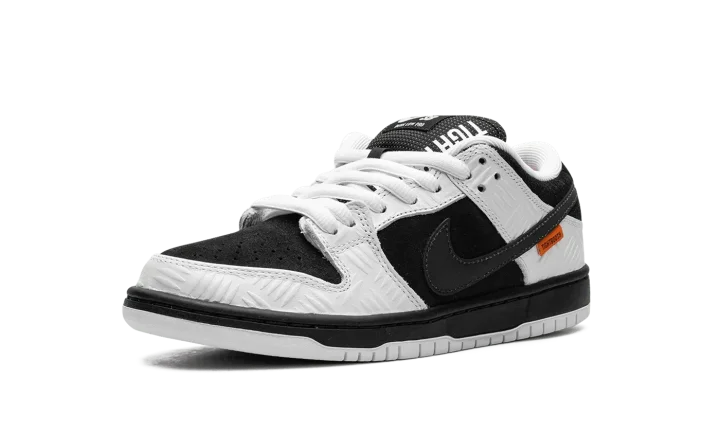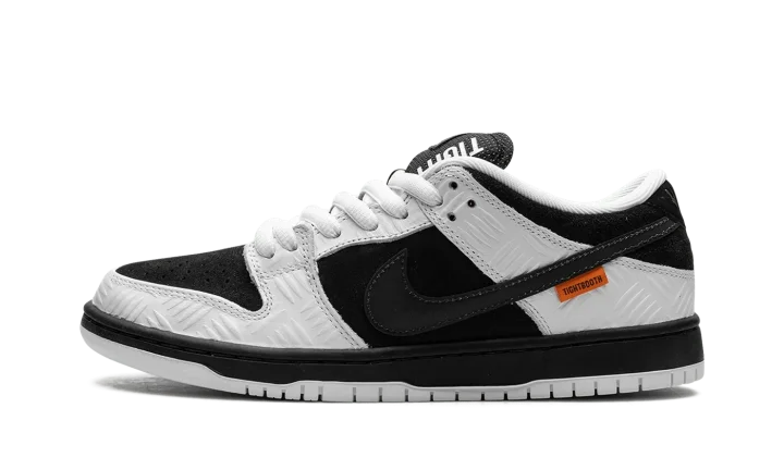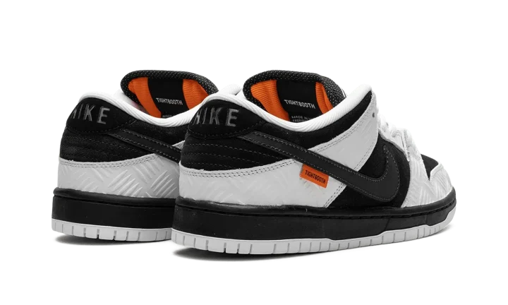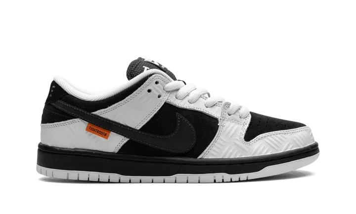 The TIGHTBOOTH x Nike SB Dunk Low is a collaboration by the Japanese skateboarding brand on the retro skate shoe. Inspired by TIGHTBOOTH's brand identity, this version of the SB Dunk Low features a black suede base contrasted with white leather overlays with a textured pattern replicating the look of metal tread plates. A black tumbled leather Swoosh logo can be seen on both sides of the shoe and an orange "TIGHTBOOTH" hang tag is seen on the lateral side of the mid-panel. Additional "TIGHTBOOTH" branding can be found on the tongue tag and lace dubrae. A black midsole and white outsole complete the look. Release date: November 11, 2023
