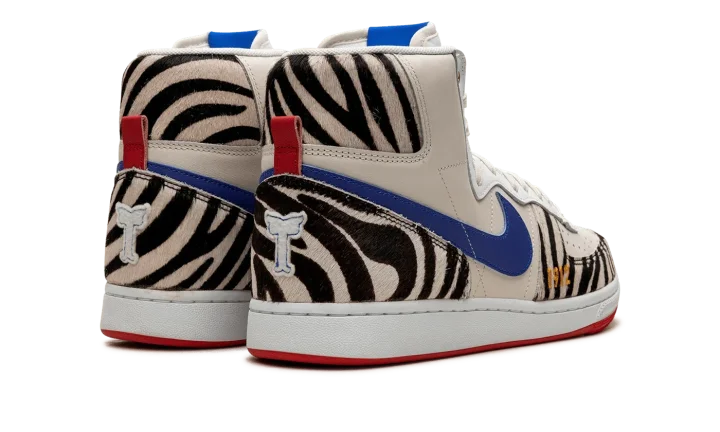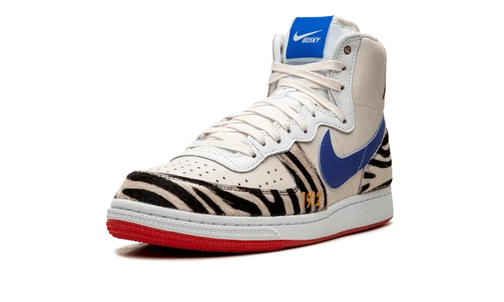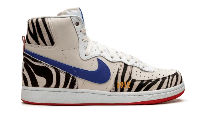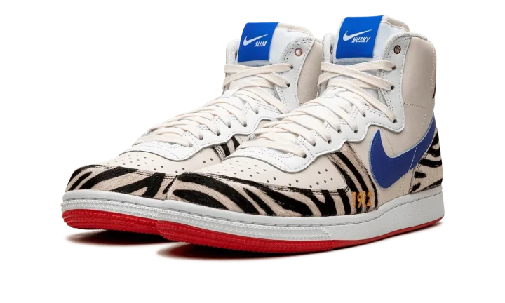The Nike Terminator High "Slim & Husky's Pizza" is a colorway of the retro sneaker inspired by the Nashville, Tennessee based pizza chain founded by Tennessee State University graduates. From a collection of HBCU-theme sneakers by Nike, the Terminator High "Slim & Husky's Pizza" has an undeniably unique look. The upper features a Phantom-colored leather base with eye-catching zebra print on the faux-pony hair overlays. Racer Blue leather Swoosh branding can be found on both sides of the shoe. A "1912" embroidered logo on the forefoot salutes TSU's founding year while "Slim" and "Husky's" detailing appear separately on the left and right tongue, respectively. Release date: November 4, 2023