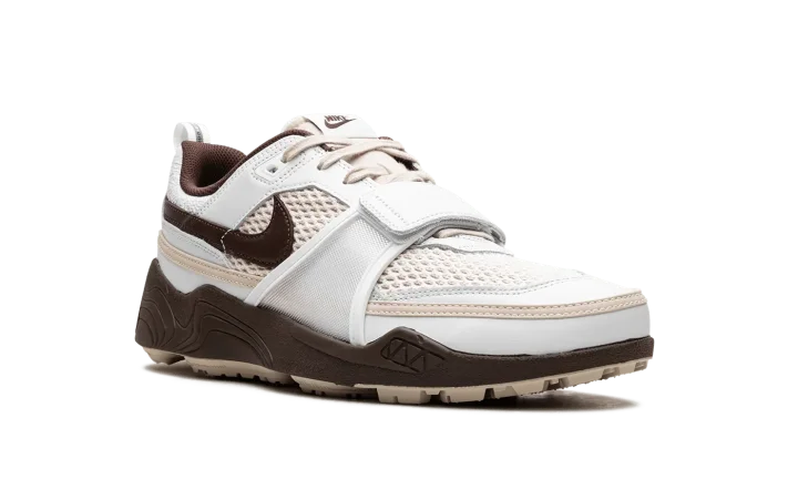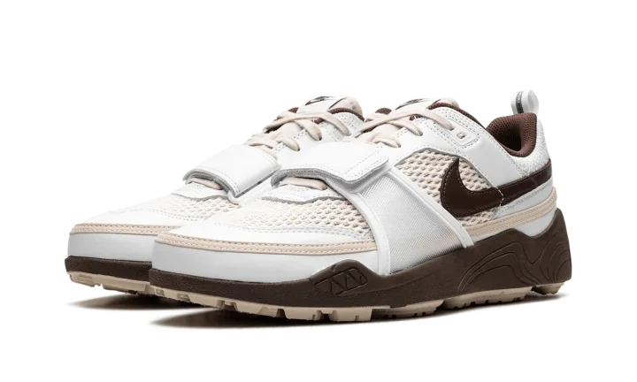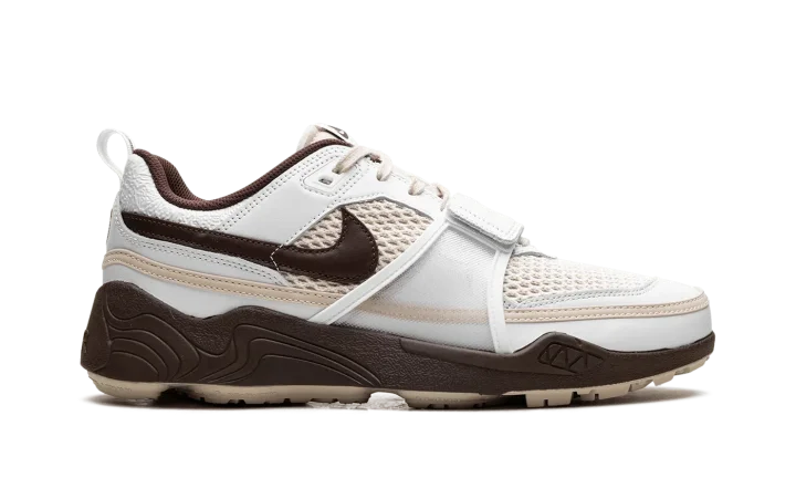 The Travis Scott x Nike Zoom Field Jaxx "Light Chocolate" continues La Flame's legacy as a sneaker designer. The training-inspired Zoom Field Jaxx has a midfoot strap similar to classic Nike cross trainers and a midsole that incorporates details from the Nike Zoom Spiridon as well as mesh panels on the upper. The white and brown colorway is reminiscent of other earth-toned Travis Scott sneakers. Cactus Jack logos appear on the heel and the medial side of the upper.