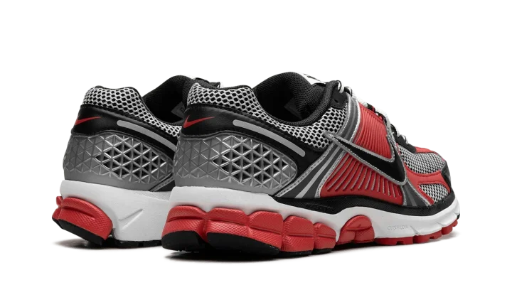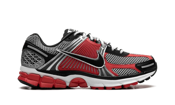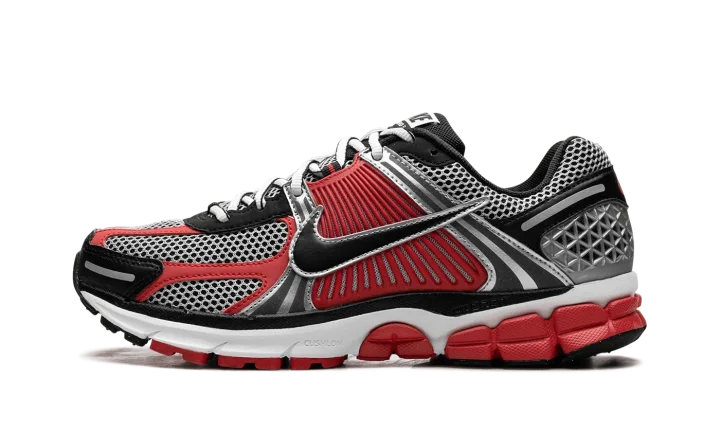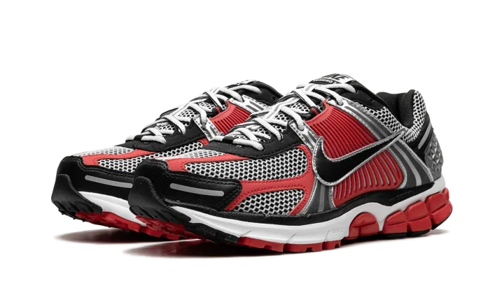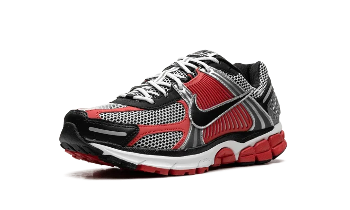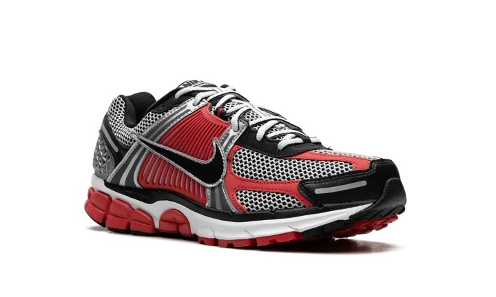 The style code HV0926-095 is for the Nike Zoom Vomero 5 Men's Shoes in the bold, high-contrast 'Metallic Silver/University Red/White/Black' colorway. This popular model revives the complex, layered aesthetic of technical running shoes from the early 2000s (Y2K).