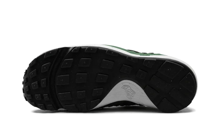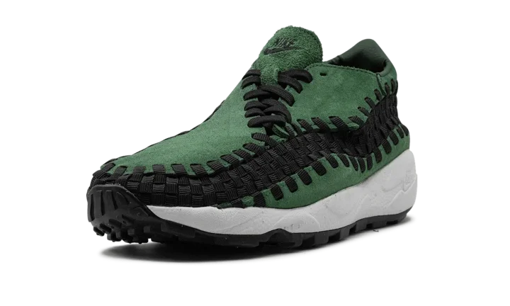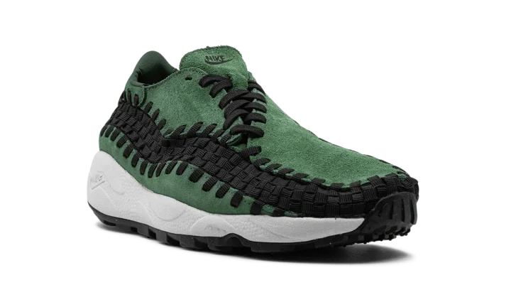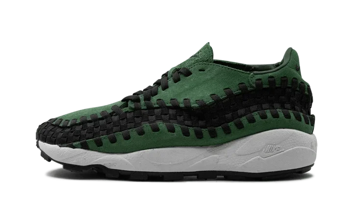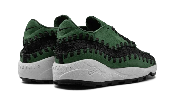The Women's Nike Air Footscape Woven "Fir" is a women's-exclusive colorway of the sneaker that combines elements from the Nike Air Footscape and Nike Air Woven with green details. The Air Footscape Woven is an attention-grabbing shoe, as it features a unique asymmetrical lacing system. The upper has a Fir, or green-colored suede construction with a black woven laces to match the weave found throughout the shoe. Classic "Nike" branding appears on the tongue. Underfoot, a white midsole and black rubber outsole complete the bold design.