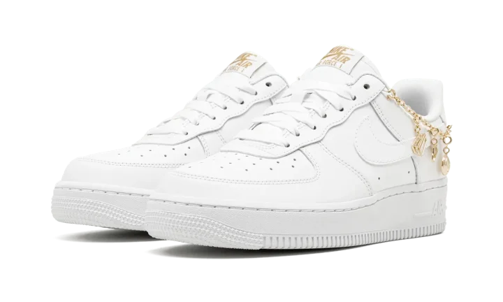 The Women's Nike Air Force 1 Low "Lucky Charms" is a women's version of the retro basketball shoe in a casual, white-based colorway that features added jewelry on its design. The "Lucky Charms" is one of several women's-exclusive variations of the Air Force 1 with flashy jewels on its design, the others being the "Bling" and Air Force 1 Shadow "Charms." On the "Lucky Charms," the entire upper, including the perforated toe, overlay panels, and Swoosh branding, are designed in white leather. Contrasting Metallic Gold "Nike Air" and Swoosh detailing are embroidered on the heel and printed on the white nylon tongue tag. A Metallic Gold chain with Nike-adjacent charms is found on the collar. Release date: November 11, 2021