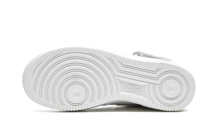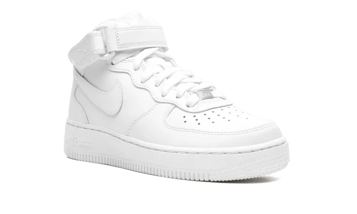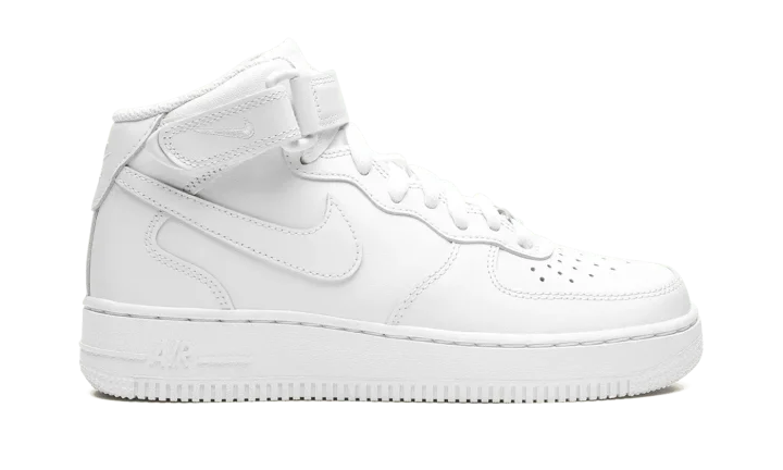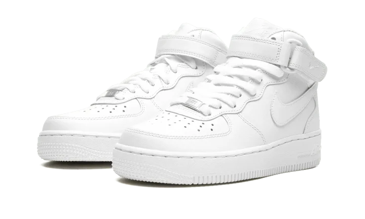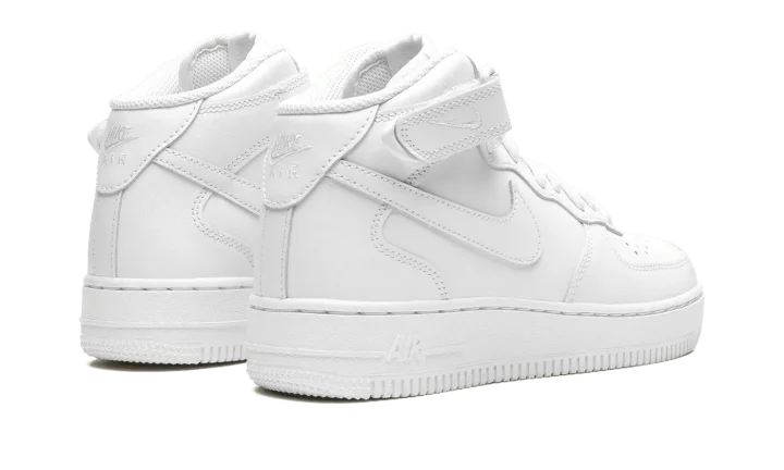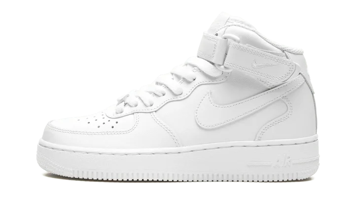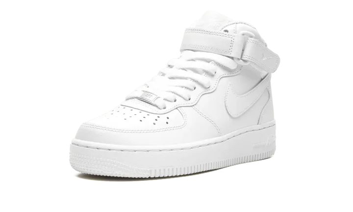 The Women's Nike Air Force 1 Mid "Triple White" is the women's sizing of the timeless, monochromatic white colorway of the classic sneaker. The "Triple White" Air Force 1 Mid is a versatile colorway of the vintage basketball shoe that has appeared on several versions of the silhouette over the years. The entire upper is constructed from crisp white leather, including the perforated toe and the mid-panel, collar, and Swoosh branding. A tonal embroidered "Nike Air" logo is stitched onto the heel and a silver "AF1" lace emblem appears on the throat. The adjustable white nylon ankle strap provides stability for the wearer. The white monochromatic look continues on the rubber midsole where white "Air" detailing on the heel of the midsole completes the design.