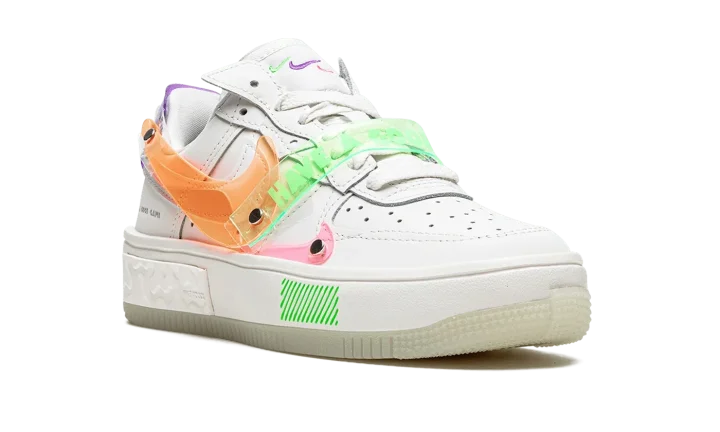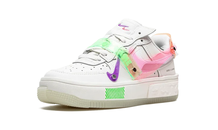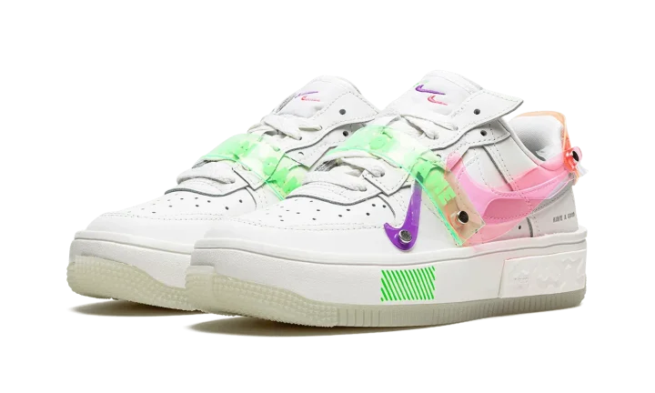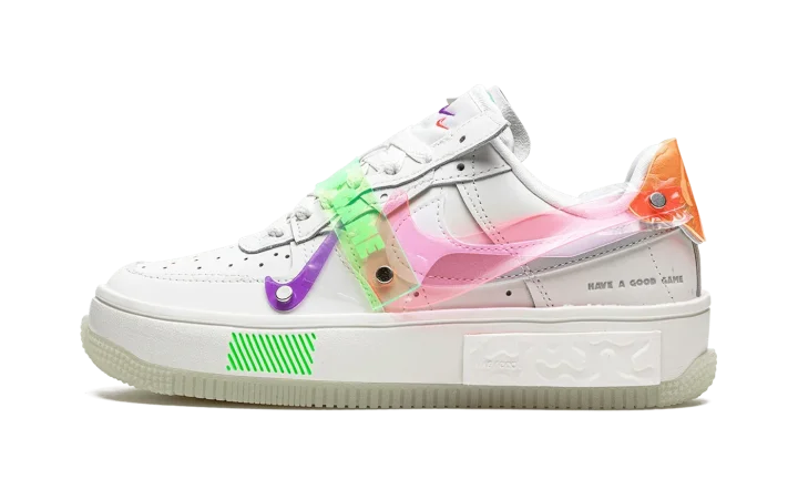 The Women's Nike Air Force 1 Low Fontanka "Have a Good Game" is a women's version of the popular lifestyle shoe with a modern design that looks to underground rave culture for inspiration. The futuristic looking Air Force 1 Low Fontanka in this fun colorway is from Nike's "Have a Good Game" collection from November 2021. It features a white leather upper with interchangeable neon green, pink, orange, and purple overlays. The Swoosh logo, heel tab, and more can be switched in and out for a different look. An icy semi-translucent outsole appears below the midsole with Nike's proprietary React foam cushioning. Release date: November 3, 2021
