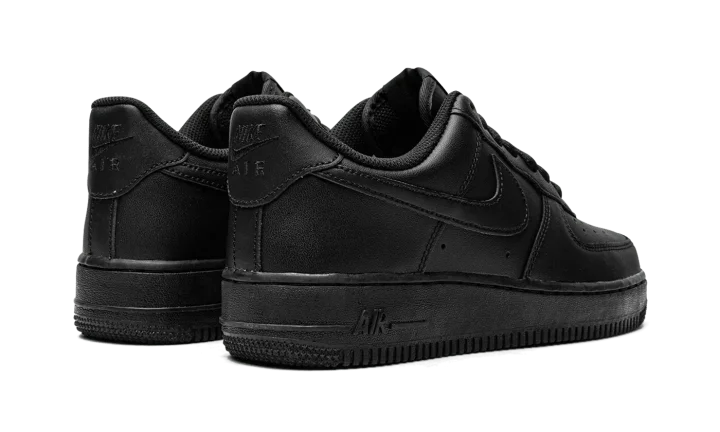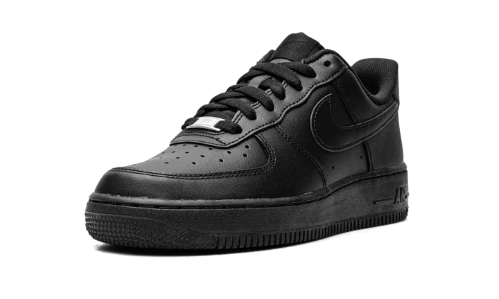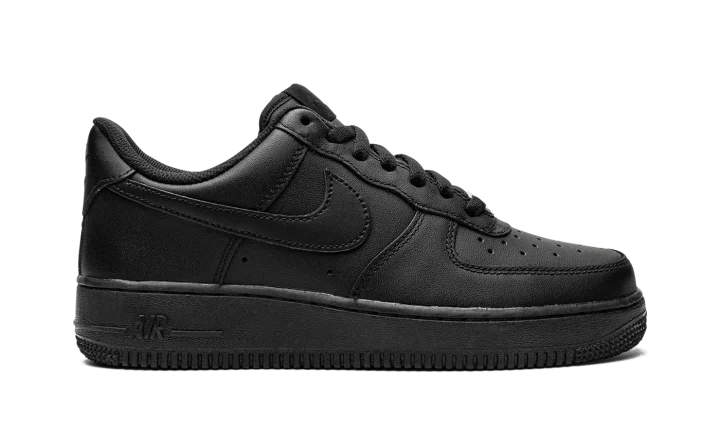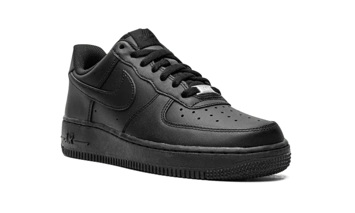 Black leather Air Force 1 '07 sneakers from NIKE featuring signature Swoosh logo detail, round toe, perforated detailing, front lace-up fastening, logo patch at the tongue, branded insole and rubber sole. These styles are supplied by a premium sneaker marketplace. Stocking only the most sought-after footwear, they source and curate some of the most hard to find sneakers from around the world..
