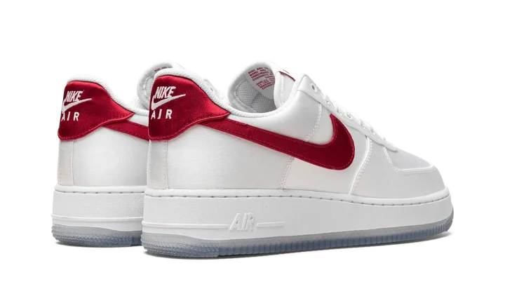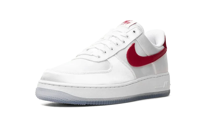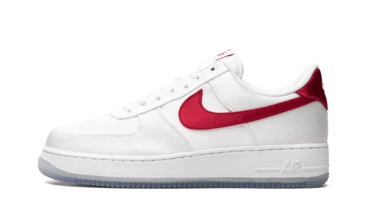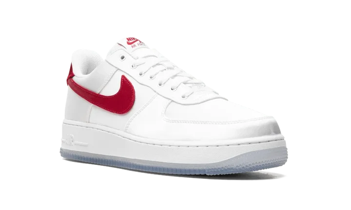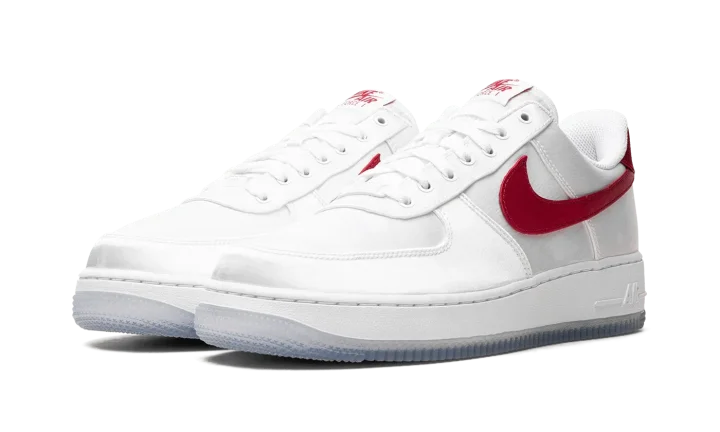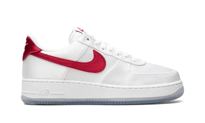 The Women's Nike Air Force 1 Low "Satin - White/Red" is a women's-exclusive colorway of the iconic lifestyle shoe. The colorway shimmers in a white satin base and red satin Swooshes appearing on each side of the shoe. More satin accenting can be found on the "Nike Air" branded heel tab. Classic red "Nike Air Force 1" detailing is printed on the tongue tag. The white rubber midsole and icy blue translucent rubber outsole complete the clean look. Release date: March 18, 2023