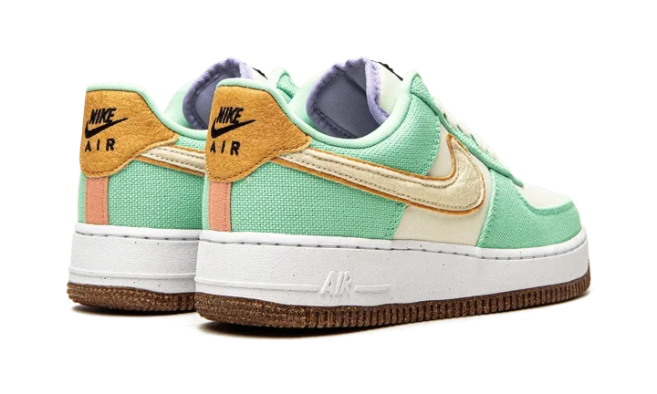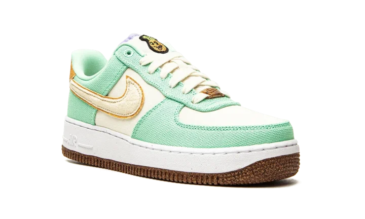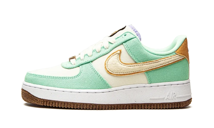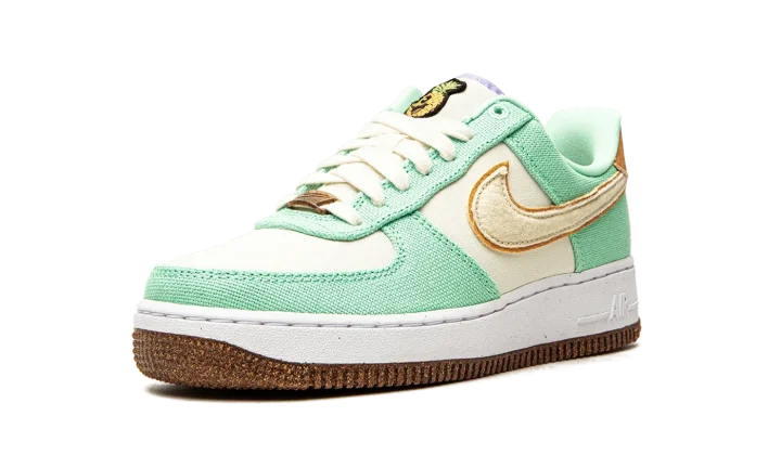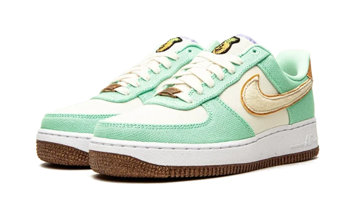 The Women's Nike Air Force 1 Low "Happy Pineapple" is a women's version of the casual lifestyle shoe with fun-loving branding made from environmentally conscious materials. From Nike's "Move to Zero" initiative that aims to reduce the brand's carbon footprint, the "Happy Pineapple" version of the Air Force 1 joins standout Nike models like the Air Max 90 and Air Max 95 in receiving a "Happy Pineapple" colorway. The upper features a Coconut Milk canvas base with Green Glow-colored canvas overlays that inspires a tropical appearance. A tan felt Swoosh appears on the sides and a brown suede heel tab with "Nike Air" and Swoosh branding is found on the back of the shoe. A smiling pineapple character is embroidered on the tongue. The cheeky pineapple reappears on the speckled cork sock liner. The Air Force 1's signature lace dubrae and outsole appear in a cork finish, a nod to the shoe's pineapple theme and Nike's efforts in sustainability. Release date: August 16, 2021