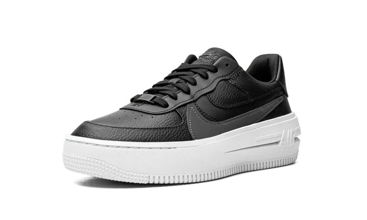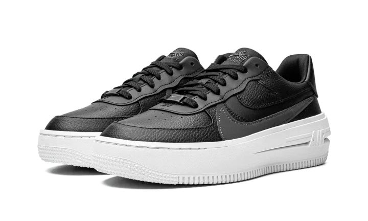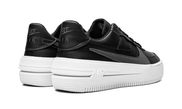 The Women's Nike Air Force 1 PLT.AF.ORM "Black" is an alternate, women's-exclusive version of the classic sneaker that elevates its silhouette with a platform-style sole and other modifications. The Air Force 1 PLT.AF.ORM features a contemporary appearance that progresses the retro basketball shoe's timeless design. The "Black" colorway features a black leather construction with an oversized tonal leather Swoosh layered over a cut-out Swoosh on either side. "Nike Air" and Swoosh logos are found on the heel and on the tongue. An oversized white rubber midsole that splits on the heel, giving the shoe a platform-style design.