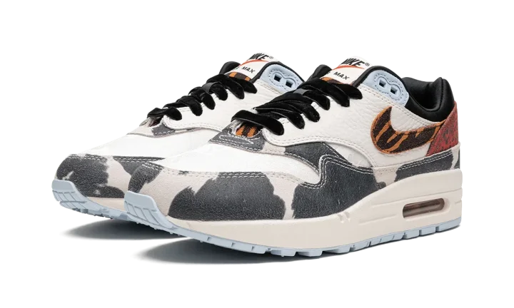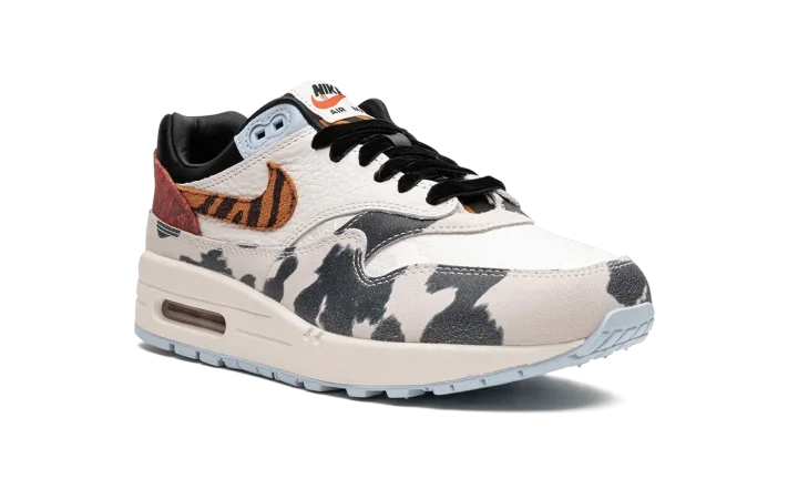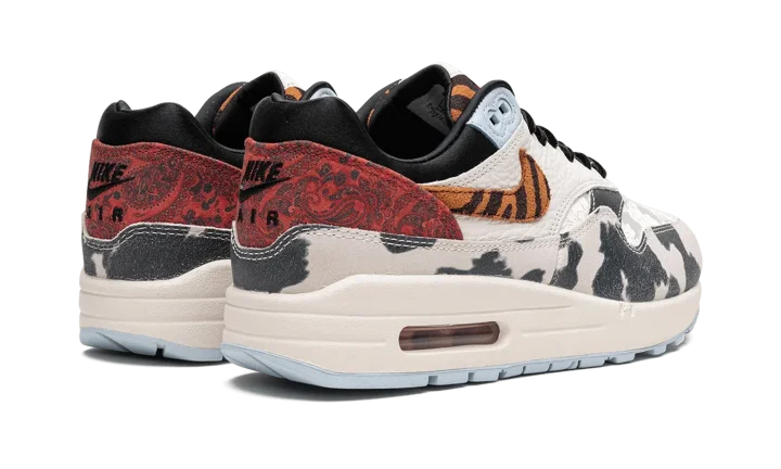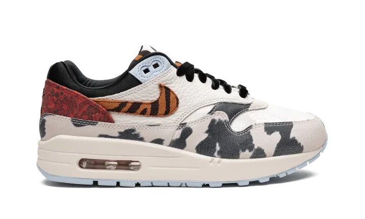 The Women's Nike Air Max 1 '87 "Tiger Swoosh Cow Print" is a women's-exclusive colorway of the retro performance running shoe that updates its classic design with unique animal-inspired patterns. One of the most creative Air Max 1s on the market, the "Tiger Swoosh Cow Print" features multiple animal patterns on its design, including a cow print textile on the mudguard and a red-and-black paisley print on the heel. A tiger stripe Swoosh appears on the sides. Velvet black laces appear on the top of the shoe. Underfoot, the shoe rides on a cream-colored foam midsole with a visible Air unit in the heel. Release date: March 15, 2023