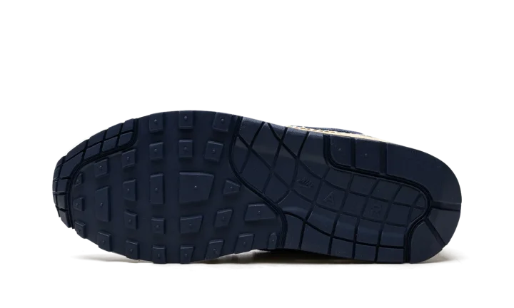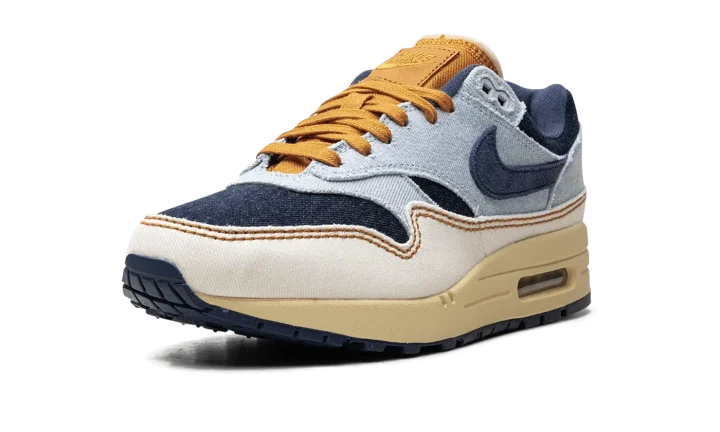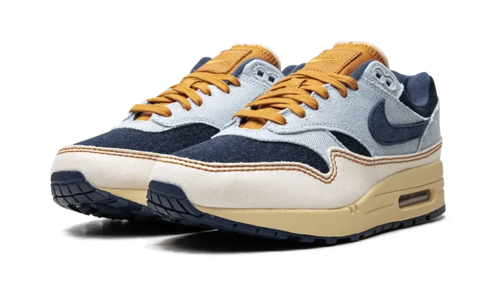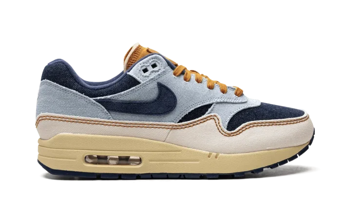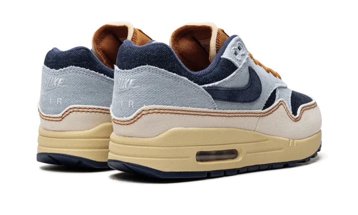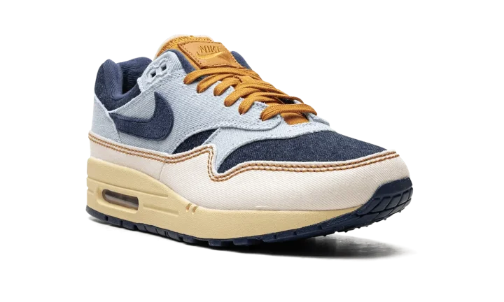 The Women's Nike Air Max 1 Denim "Aura/Midnight Navy" is the women's sizing of the retro running shoe in a colorway made with a unique combination of materials. The upper features a denim construction, with the base appearing in Midnight Navy and the overlays appearing in a light blue hue. A Midnight Navy Swoosh can be found on either side of the shoe. A white "Nike Air" logo is embroidered on the heel. The tongue, laces, and "Nike" branded tongue patch are designed in tan. An Air Max cushioning unit appears in the heel of the vintage-looking midsole. Release date: November 7, 2023