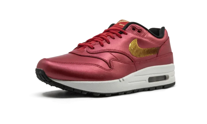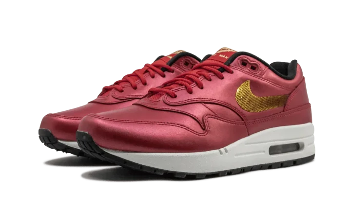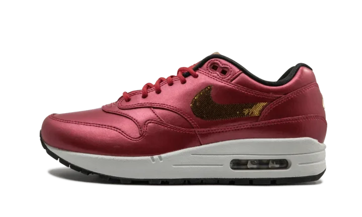 The Nike Air Max 1 Women's lifestyle sneaker, with its vibrant hue and glamourous detailing, instantly transforms the iconic Air Max pair into something far more fashion forward. Wrapping the foot is a premium leather upper in deep red, which sees a subtle sheen that adds oomph to the overall aesthetic. But the fun doesn't stop there. The Nike Swoosh on the lateral side is decorated with metallic gold sequins and Nike branding is embroidered in a stately gold. The bottom half keeps things simple with a white midsole and black outsole.