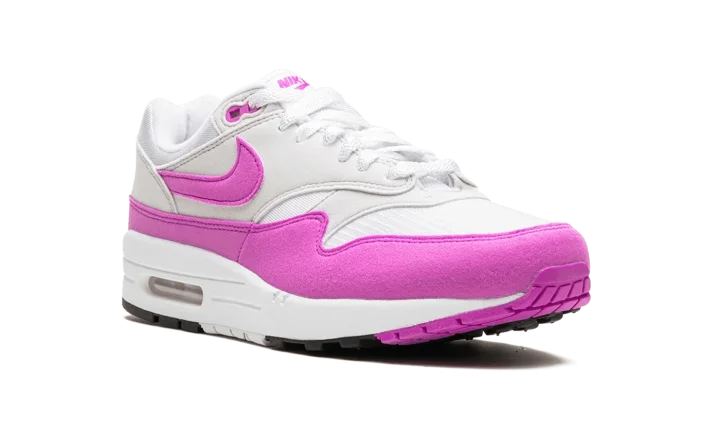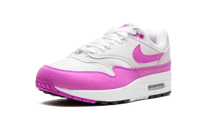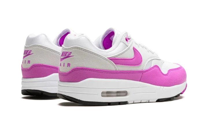 The Women's Nike Air Max 1 "Fuchsia Dream" is a women's-exclusive colorway of the retro performance running shoe with eye-pleasing accents. The upper features a white mesh base with grey suede on the overlays. A Fuchsia Dream-colored Swoosh appears on each side. More Fuchsia Dream accenting is seen on the mudguard, on the "Nike Air" branding on the heel and tongue tag, and on the top eyelets. Underfoot a visible Air unit in the heel of the white foam midsole completes the look. Release date: July 27, 2023