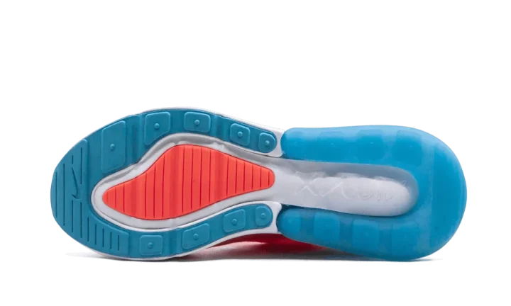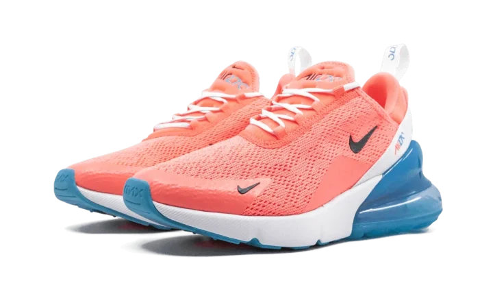 The Nike Air Max 270 "Lava Glow" gets a makeover with this fresh colorway. The sneaker is created with a large aqua blue Air Max unit and a bright orange mesh upper and black Swoosh branding. A stretchy inner sleeve of the silhouette creates a snug fit and feels comfortable, while Nike Air cushioning adds spring to your step. The rubber outsole provides durable traction. Taking design cues from Air Max icons of the past, the Nike Air Max 270 is planted firmly in the present—and future.
