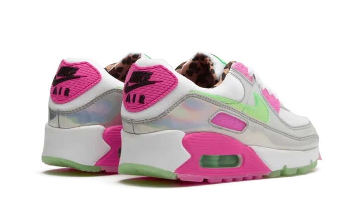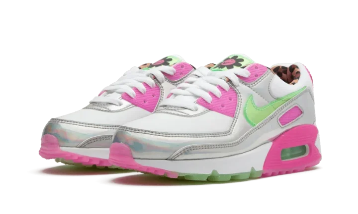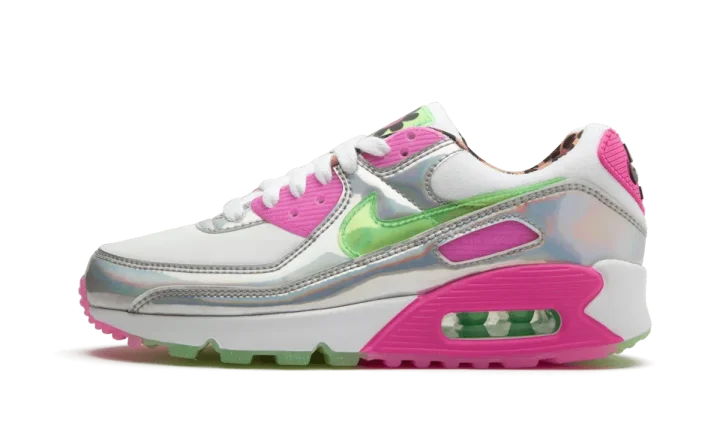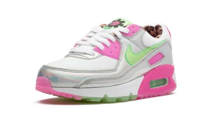 The Nike Air Max 90 LX "Iridescent Leopard" is a women's exclusive style that honored the iconic silhouette's 30th birthday in 2020. Starting with white and pink on the upper, this style plays up the Air Max 90's fun side. Nike makes the celebratory style pop with iridescent materials and a touch of animal print, creating a bold look. Replacing the traditional Nike branding is a playful daisy motif on the tongue patch and insole graphic. Staying true to its roots, the Nike sneaker uses its original waffle sole, along with stitched overlays and classic TPU accents.