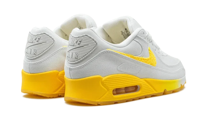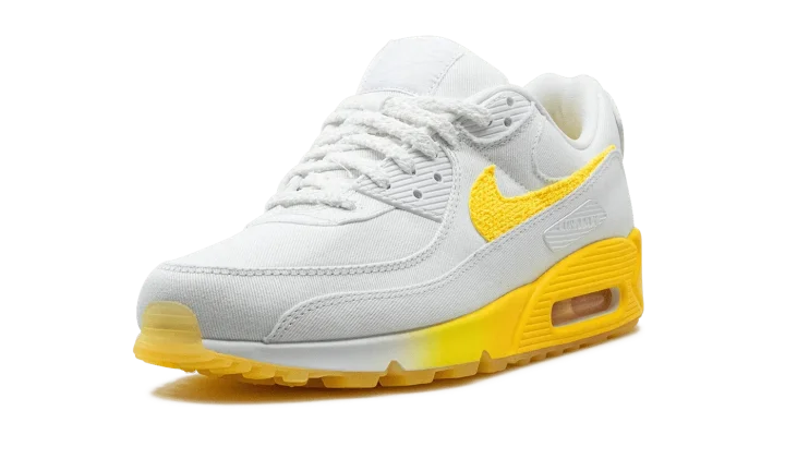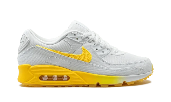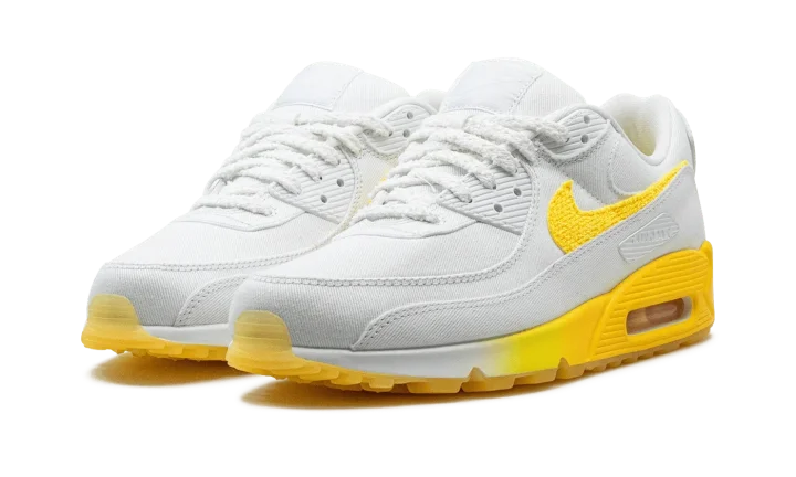 The Women's Nike Air Max 90 "Citrus Pulse" is a women's-exclusive colorway of the retro running shoe that modifies its design in a unique way. The Air Max 90's original and standard mesh-and-leather design is overhauled on the "Citrus Pulse" colorway, as it features a white canvas upper with a Citrus Pulse chenille Swoosh on each side. A small "Air Max" logo hit appears on the lateral side of the sneaker and tonal "Nike Air" insignia is found on the heel. A gradient white-to-yellow midsole completes the look. Release date: March 4, 2023