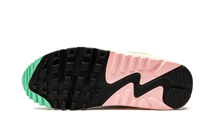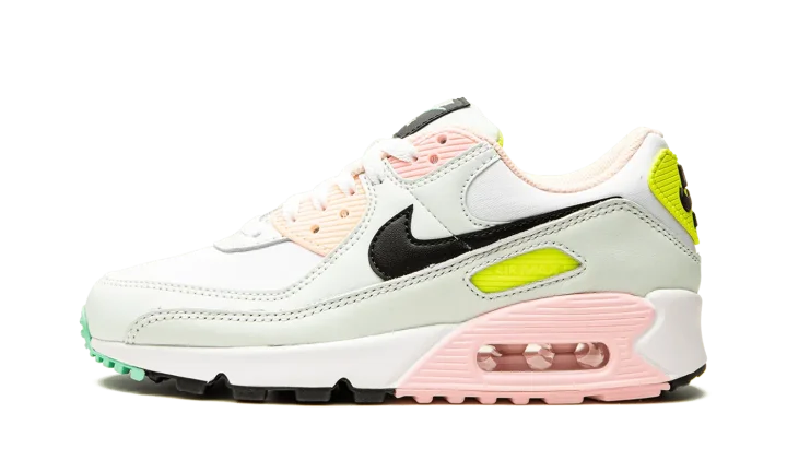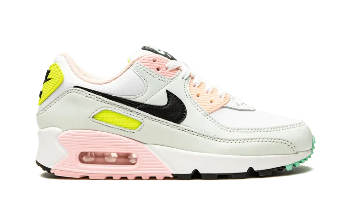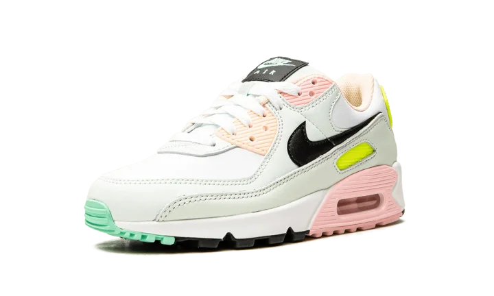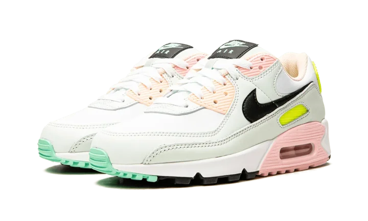 The Women's Nike Air Max 90 "Easter" is a women's-exclusive release of the beloved sneaker in a colorway dedicated to the springtime holiday. An April 2021 release, the "Easter" Air Max 90 features soothing pastel colors on its design as a nod to the colors commonly associated with Easter and spring. The upper is complete with a white textile base with a contrasting mint green-colored leather mudguard and mid-panel overlay. A black leather Swoosh is found on either side. A Volt "Air Max" branding window appears on the lateral side of the shoe. The top and lower eyelet panels are designed in pastel pink and peach, respectively. Teal "Nike Air Max" detailing is located on the tongue tag and black "Nike Air" and Swoosh branding is found on the Volt heel tab on the back of the shoe. Release date: April 27, 2021