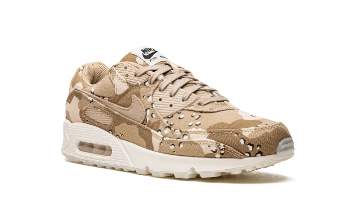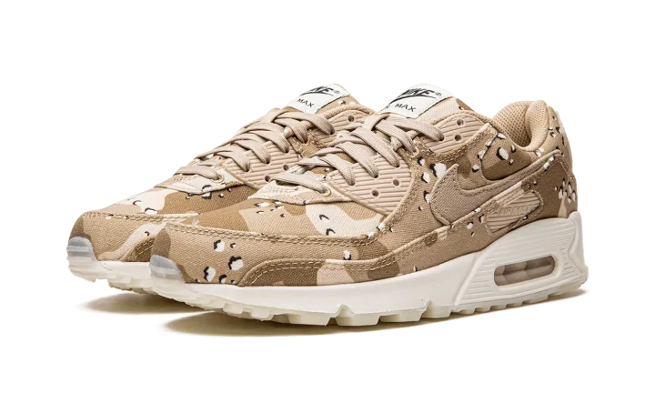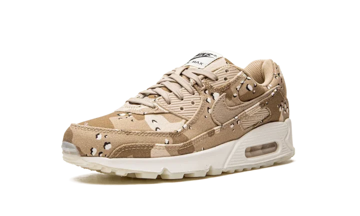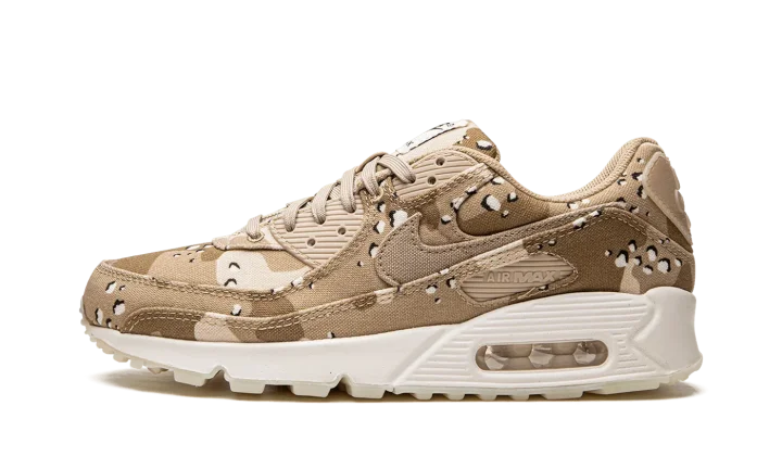 The Women's Nike Air Max 90 "Desert Camo" is a women's-exclusive colorway of the retro performance running shoe with an all-over camouflage look. A September 2022 release by Nike, the Air Max 90 "Desert Camo" features the hard-to-miss camo print in an all-over pattern on its upper, including on the toe, mid-panel, collar, heel, and overlays. A brown canvas Swoosh appears on either side of the shoe and continues the colorway's military vibe. Additional brown accents include a brown "Air Max" branding window on the lateral side of the heel and brown overlay with a "Nike Air" logo on the heel. A Sail midsole with visible Air cushioning and a milky translucent rubber outsole complete the look. Release date: September 21, 2022