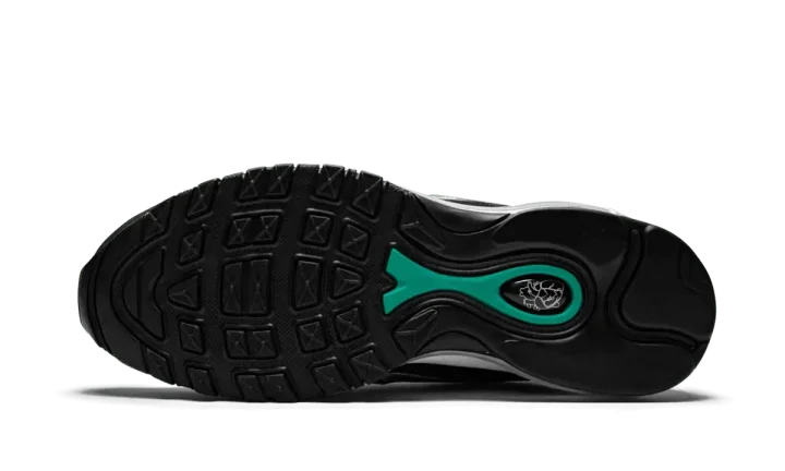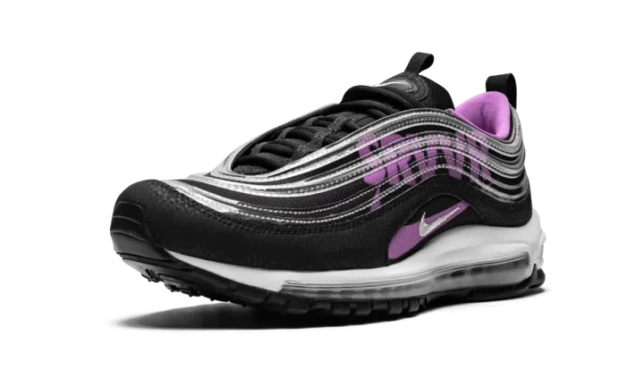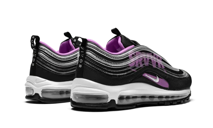 The Nike Air Max 97 DB was originally released in December 2018 as part of the brand's annual Doernbecher Freestyle collection to benefit the OHSU Doernbecher Children's Hospital in Portland, Oregon. It was designed by 16-year old Kirsten Brown. A black mesh and textured leather upper features translucent overlays. "SRVVR" is written in large purple lettering on each side panel. "Survivor" is also written in teal on each heel tab. Other special markings that allude to Brown surviving heart transplant surgery include green and red ribbons on each outsole to represent heart transplant and stroke awareness, the date of her surgery, and EKG readings on the insoles.