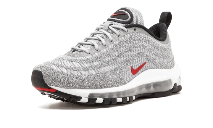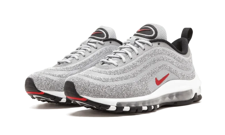 Nike has pulled out all of the stops as it celebrated the 20th anniversary of the Air Max 97. 2017 has seen the iconic model return in classic colorways, as well as an array of lifestyle-friendly designs. That includes this luxe women's version encrusted with real Swarovski crystals. The lavish design first appeared on a clean black and white pair. And now we see the look on take form on the classic "Silver Bullet" colorway. Here, we see the OG Metallic Silver motif embedded throughout a fuse upper constructed with nylon materials. Hits of Varsity Red and black complete the show.