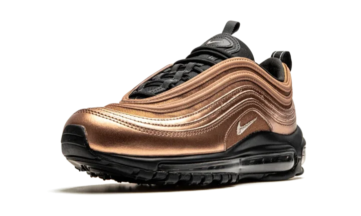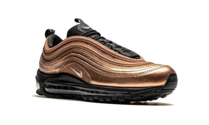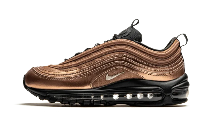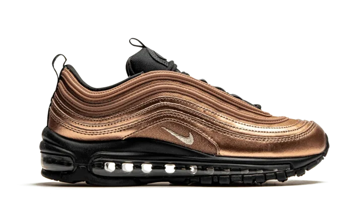 The Women's Nike Air Max 97 "Copper" gives the Air Max 97 silhouette an eye-catching, molten treatment. Dubbed "Copper," this Nike lifestyle sneaker features a metallic copper premium leather and mesh upper that creates a monochromatic look on the shoe's signature wavy lines and sits atop a sleek black outsole. For a touch of elegance and contrast, the tongue, heel pull tab, and mudguard match the sole in black. Rounding out the design is the iconic 3M reflective piping details found throughout the upper.