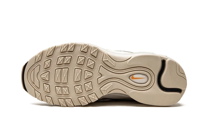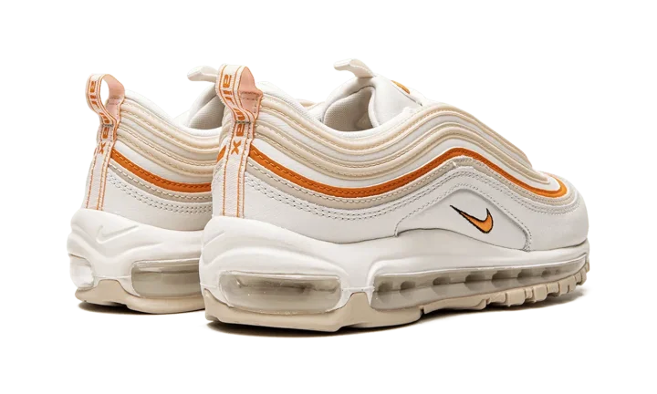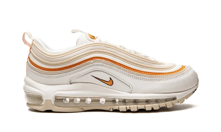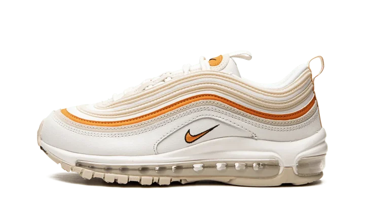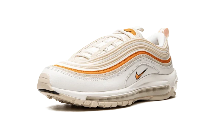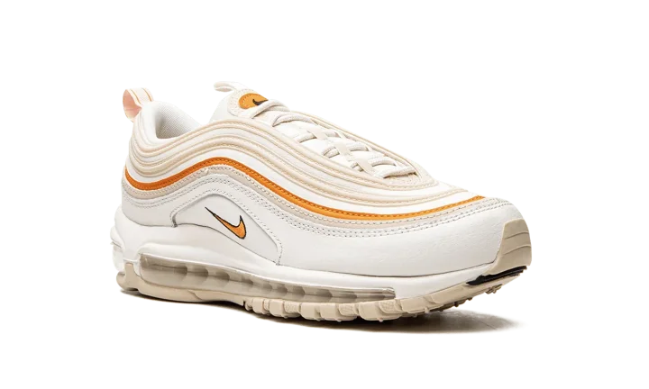 The Women's Nike Air Max 97 "Phantom/Light Curry" is a women's-exclusive colorway of the vintage performance running shoe with an autumn-inspired appearance. A clean look for the popular Air Max 97, the "Phantom/Light Curry" features a white leather upper with tonal, cream, and Light Curry-colored leather overlays in a wavy design that wrap around the shoe. A small orange embroidered Swoosh appears on either side of the shoe above the white foam midsole. Additional orange accenting can be found on the "Air Max" branding on the nylon heel tab and on the overlay on the tongue with black Swoosh detailing. A full-length visible Max Air cushioning system is found in the midsole and completes the look. Release date: May 7, 2022