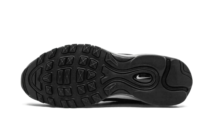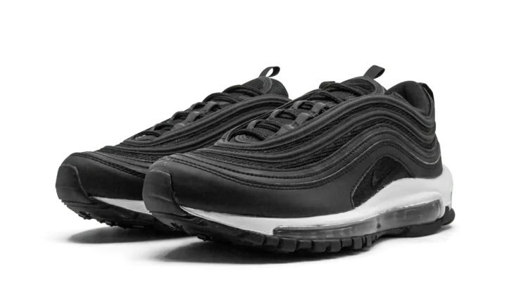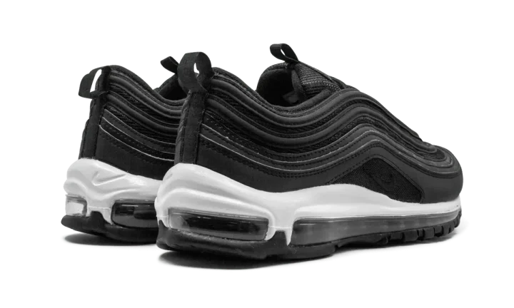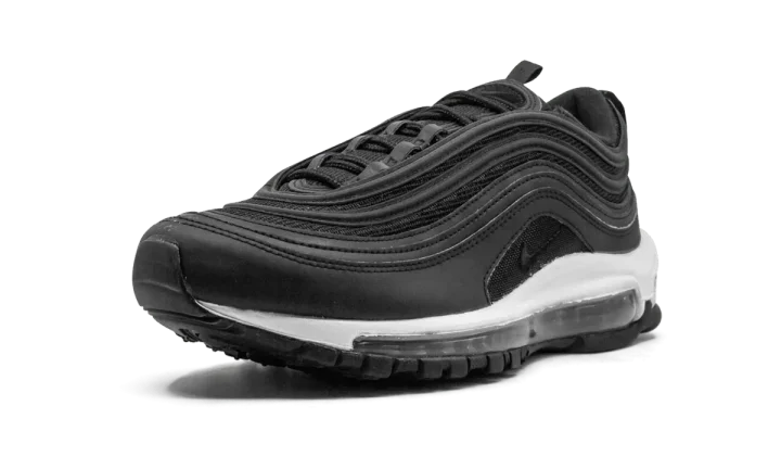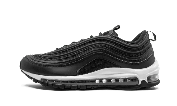 The Nike Air Max 97 women's shoe presents a neutral colorway for sneaker fans who prefer a look that's off the traditional color wheel. This style receives a bold, tonal makeover with slick black covering the upper and rubber outsole below. In between the two on the midsole is a contrasting white full-length Max Air cushioning unit. Black-shaded branding tops off the design. The Nike Air Max 97 silhouette also includes iconic details of water-ripple lines and reflective 3M piping.