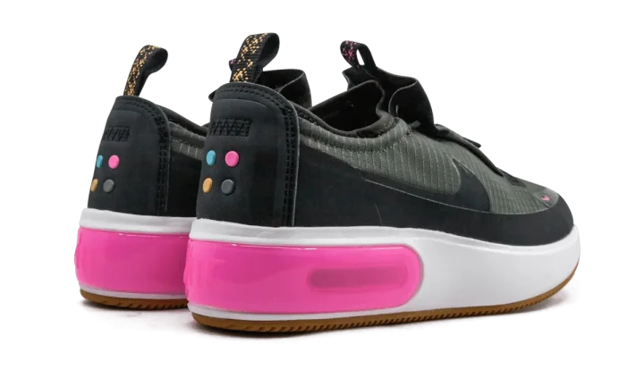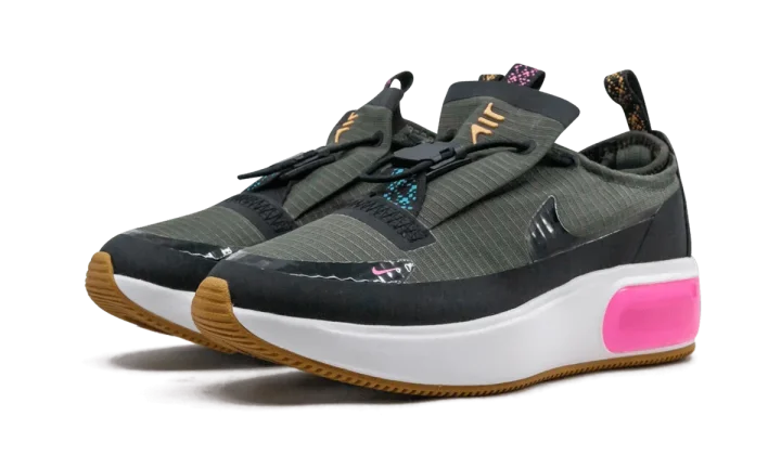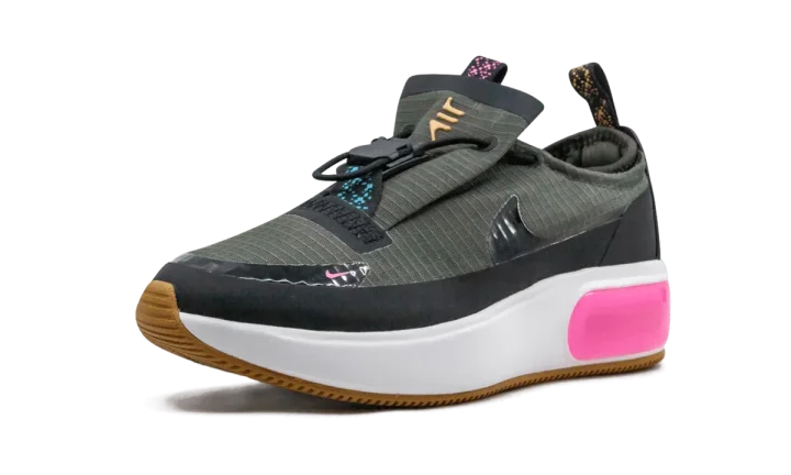 The Nike W Air Max Dia Winter "Cargo Khaki" is a women's only sneaker designed for the harshest conditions. A Cargo Khaki ripstop upper provides the perfect foil for pops of color throughout the shoe. A bright blue design pops on the fabric connecting the pull-tab lace system; pale orange "Air" branding sits at the top of the tongue; pink and orange designs mark the heel and tongue tabs; and a quartet of pink, orange, blue, and black dots form a square on the heel. A black Swoosh extends along the forefoot, obscured slightly by a black mudguard on top of an oversized white midsole. An oversized translucent pink covering shows off a large Air Max unit at the heel, and a gum outsole finishes this splashy but rugged look.