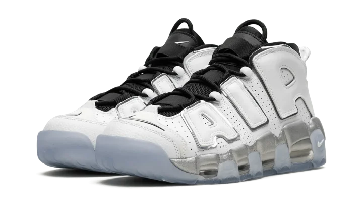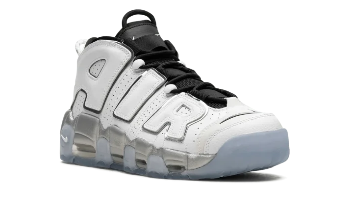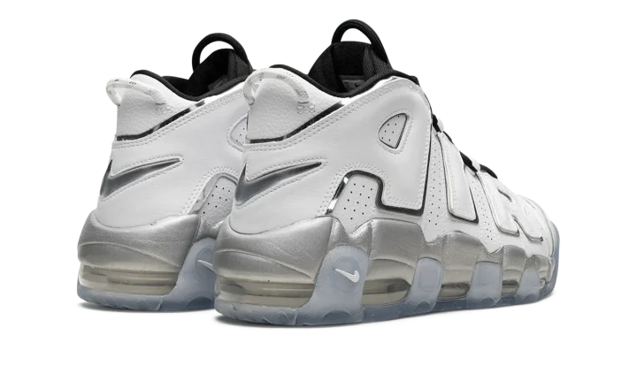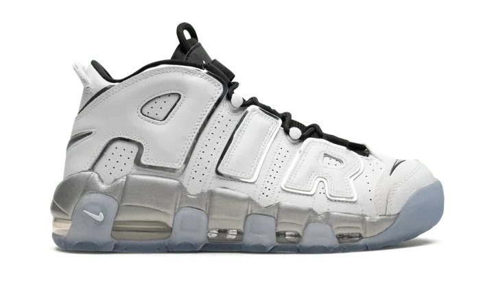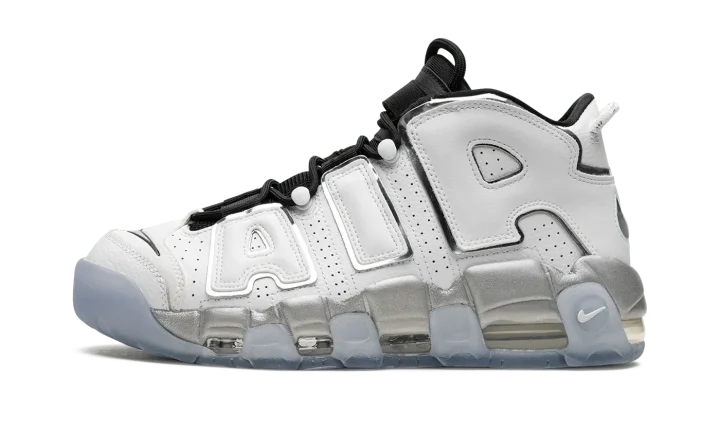 The Women's Nike Air More Uptempo "White Metallic" is a women's version of the retro basketball shoe with a flashy appearance. In the "White Metallic," Nike updates the Air More Uptempo, the shoe worn by Scottie Pippen with the Chicago Bulls during the 1995-96 NBA season, with a versatile look. The shoe features a white leather construction with its signature graffiti-inspired "AIR" branding on the sides outlined in metallic silver. The black mesh tongue, laces and elastic overlay straps add contrast. More metallic silver accenting appears on the painted foam midsole, and an icy clear outsole completes the bold design. Release date: May 5, 2023