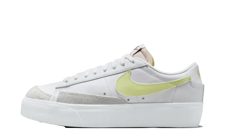 This shoe takes the classic, vintage-inspired Nike Blazer Low silhouette and gives it a modern, elevated update with a lifted, platform midsole/outsole. It features a white leather upper, with vibrant accents of lime green and team orange, making it a bold, fashion-forward lifestyle sneaker.