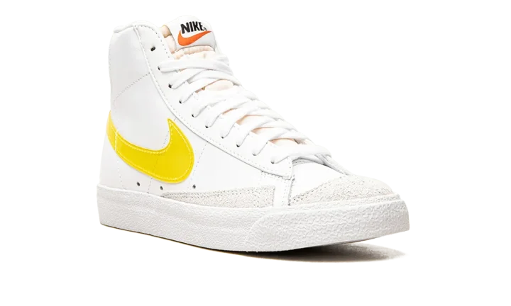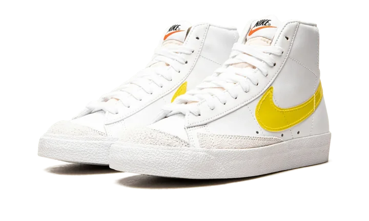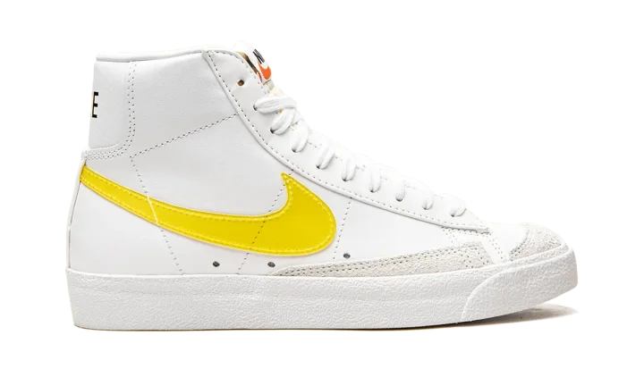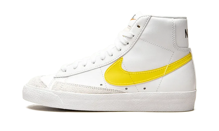 The Nike Blazer Mid '77 "Translucent Yellow Swoosh" is a colorway of the lifestyle shoe that modifies its 1970's-era styling with a modified Swoosh. The Blazer Mid '77 Vintage is based on an era-specific version of the old school basketball shoe and, here, features a translucent yellow Swoosh on the sides of its white leather upper. Both the toe and the forefoot are complemented by grey suede panels. A retro "Nike" logo appears on the tongue and old school "Nike" branding is found on the heel. The cream rubber sole gives the shoe a decidedly vintage look.